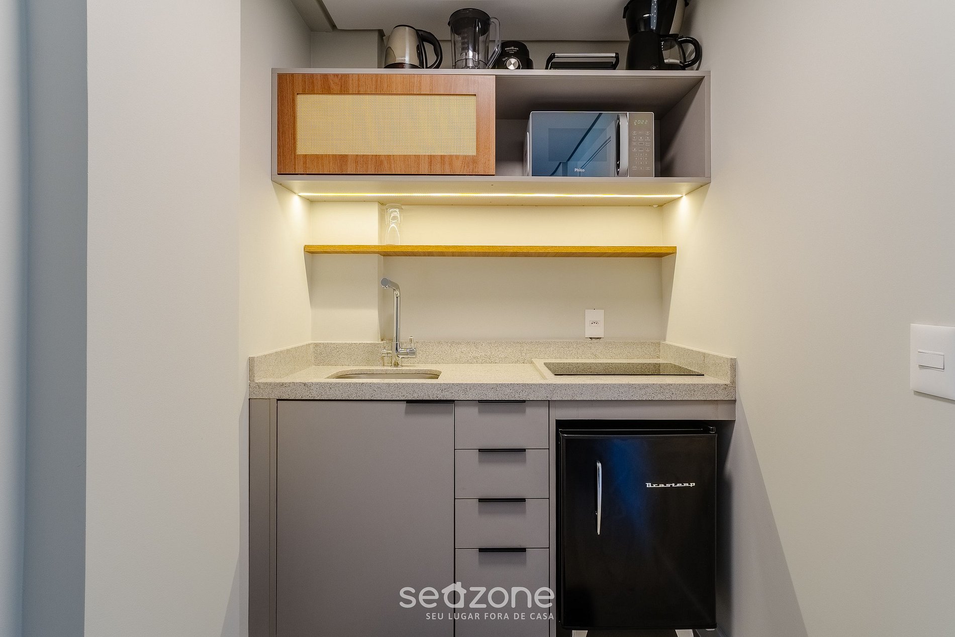 - Cozinha completa com frigobar, cooktop (indução), micro-ondas, sanduicheira, cafeteira elétrica, chaleira, liquidificador, taças de vinho, panelas, louças e utensílios;