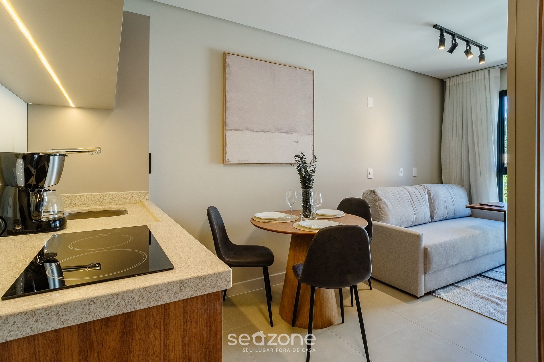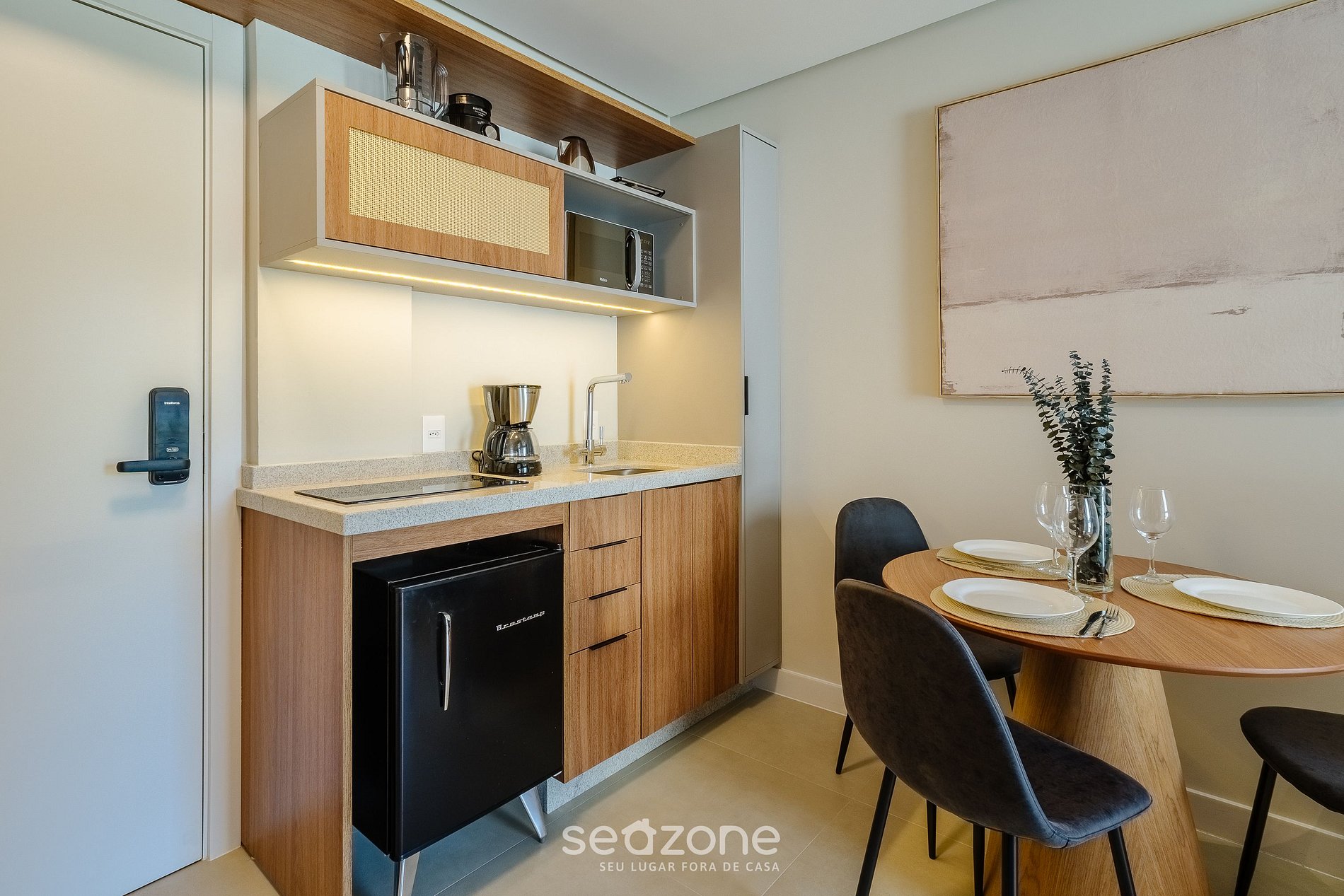 - Cozinha completa com frigobar, cooktop (indução), microondas, sanduicheira, cafeteira elétrica, chaleira, liquidificador, taças de vinho, panelas, louças e utensílios;