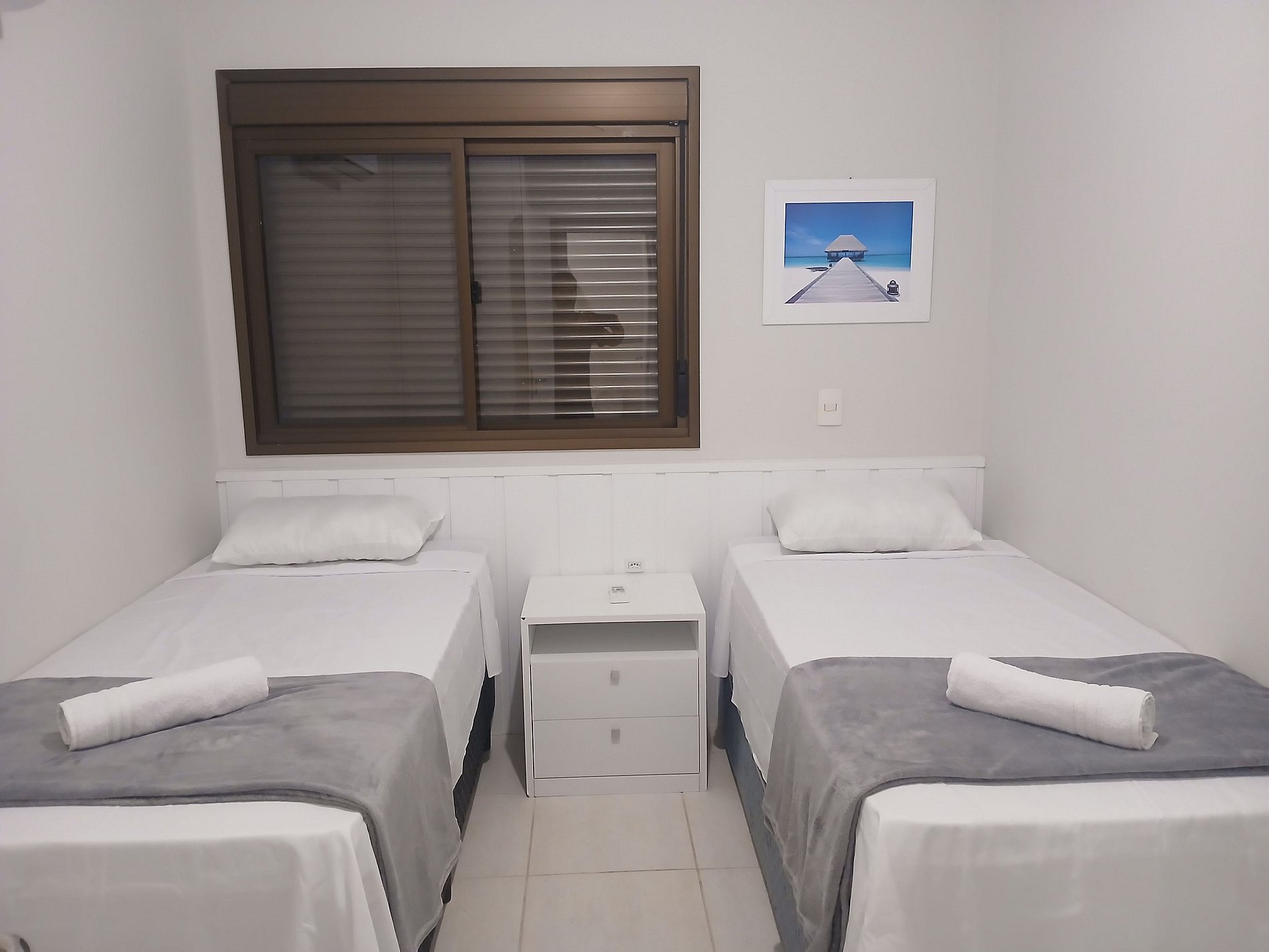 - 1 Quarto com 2 camas de solteiro, 1 cama auxiliar de solteiro, armário e ar-condicionado;