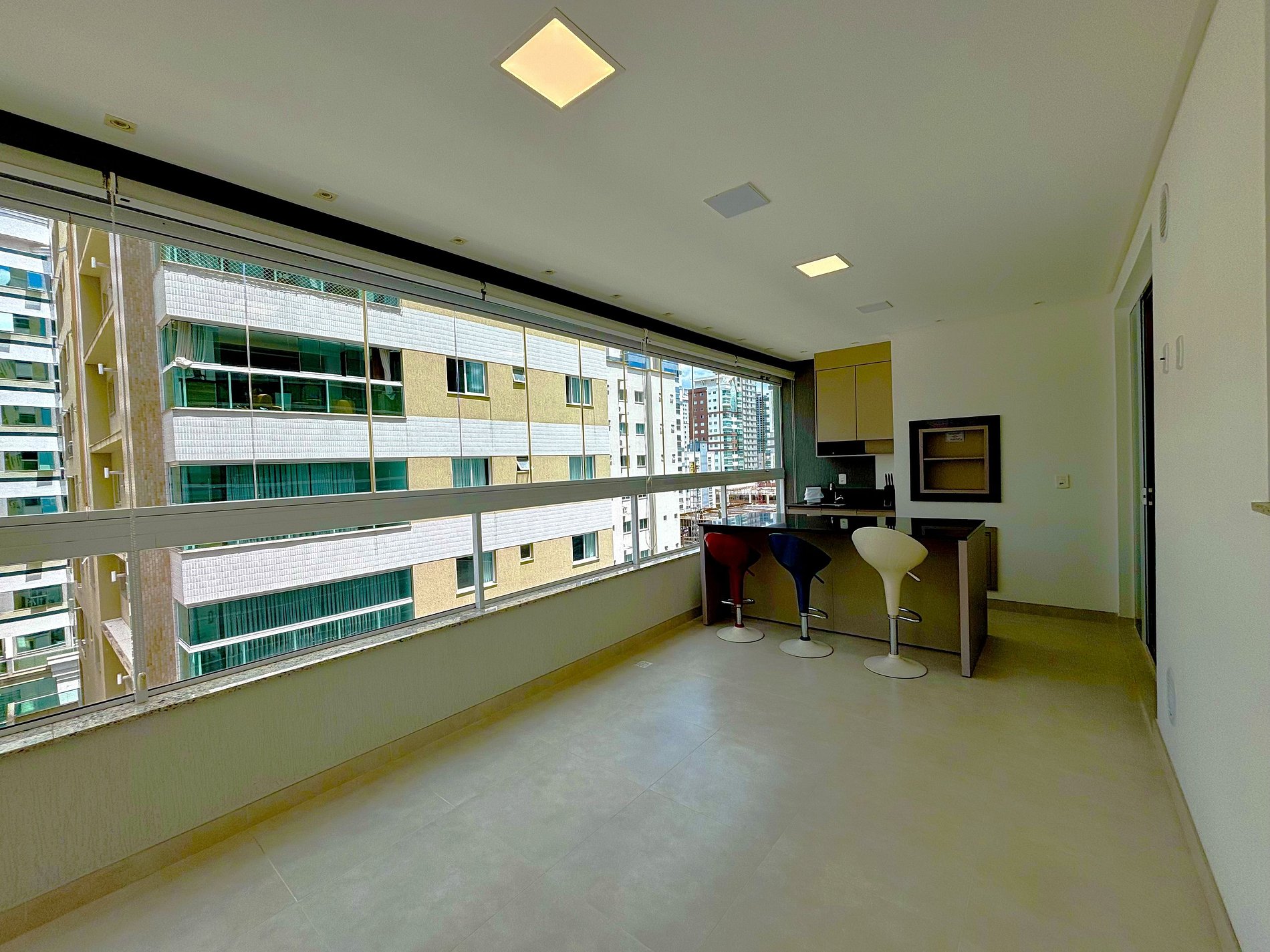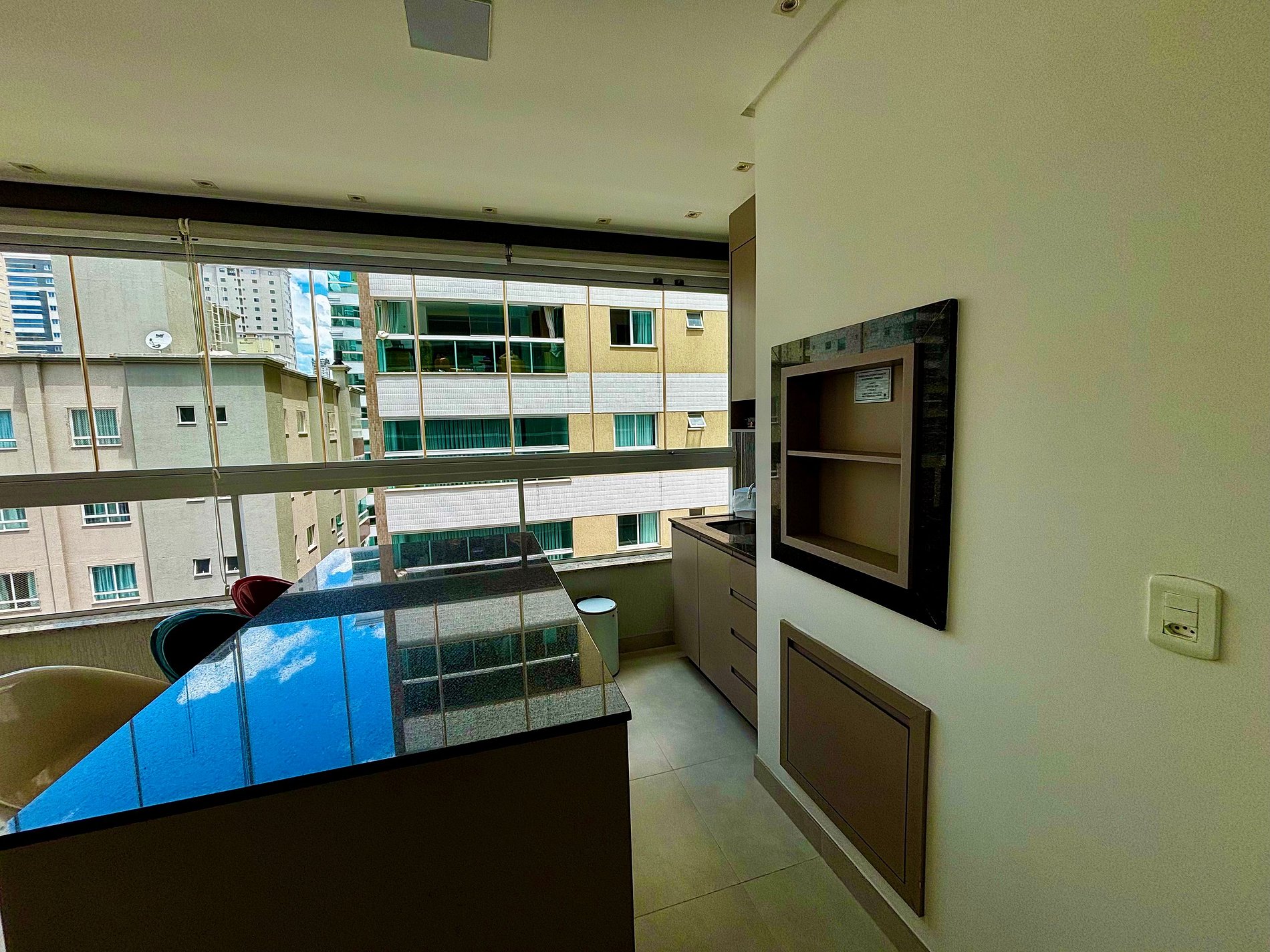 - Varanda gourmet com churrasqueira, móveis e vista para a cidade;