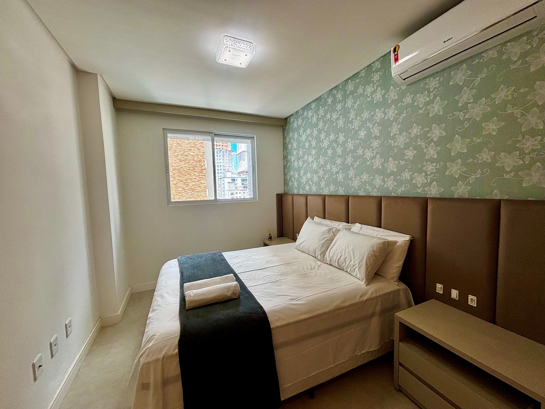 - 1 Quarto com cama de casal, armário e ar-condicionado;