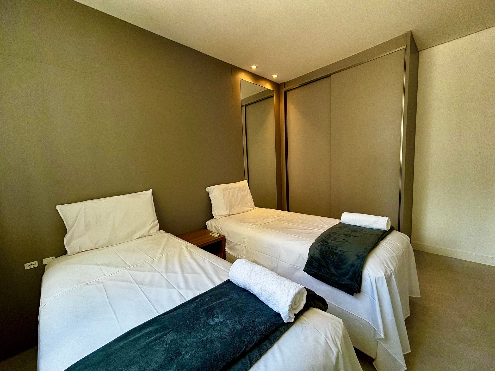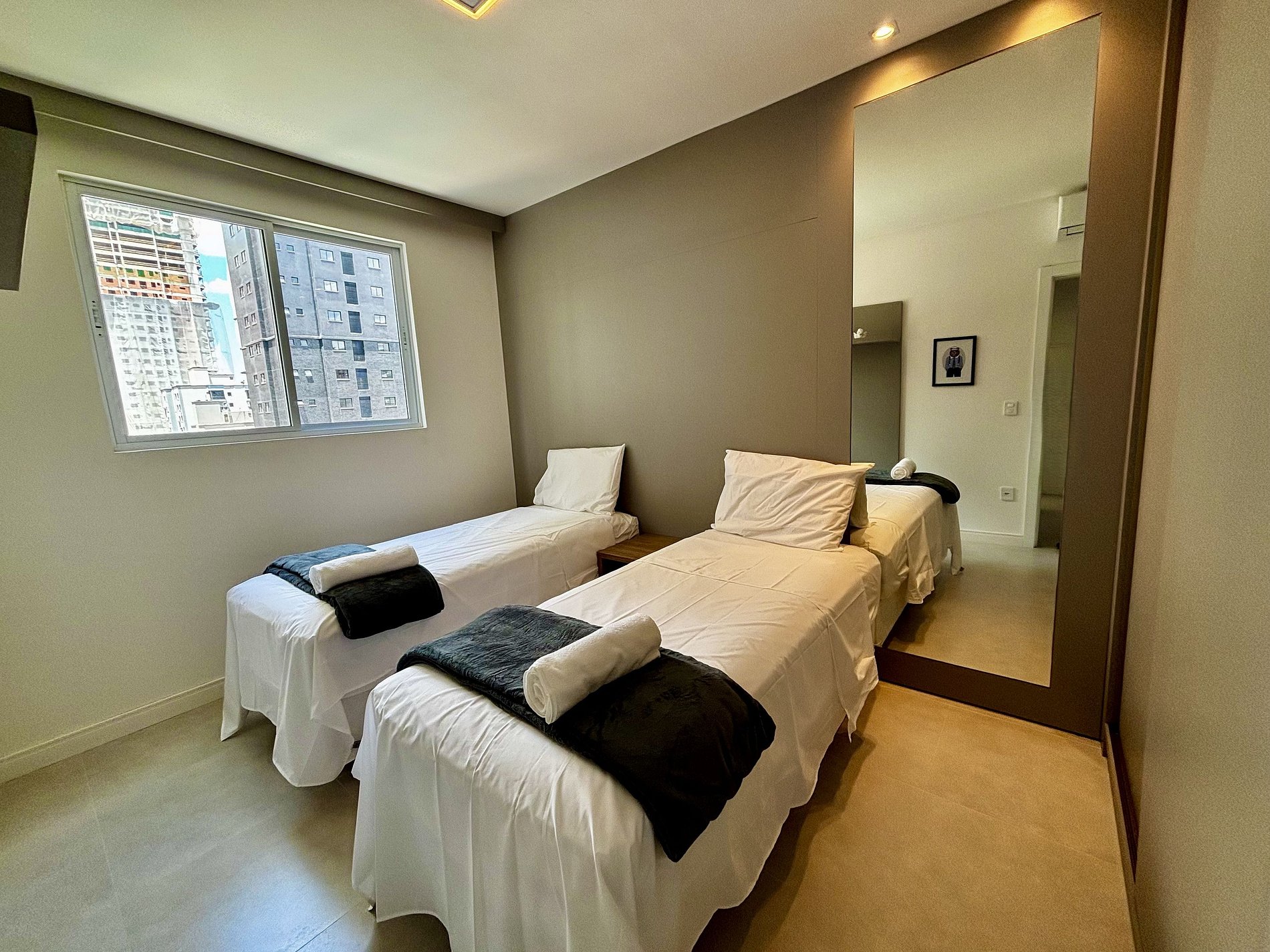 - 1 Quarto com 2 camas de solteiro, armário e ar-condicionado;