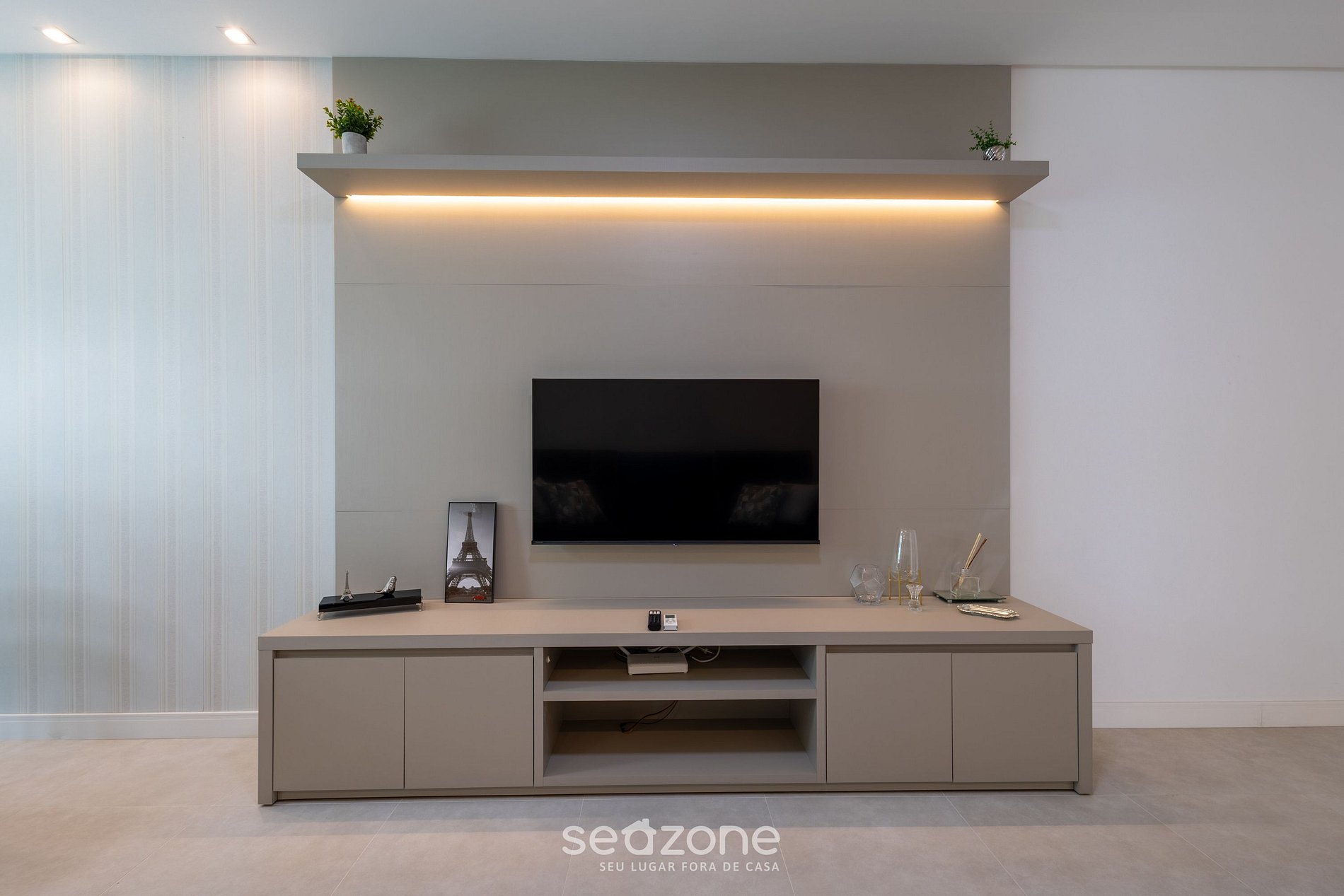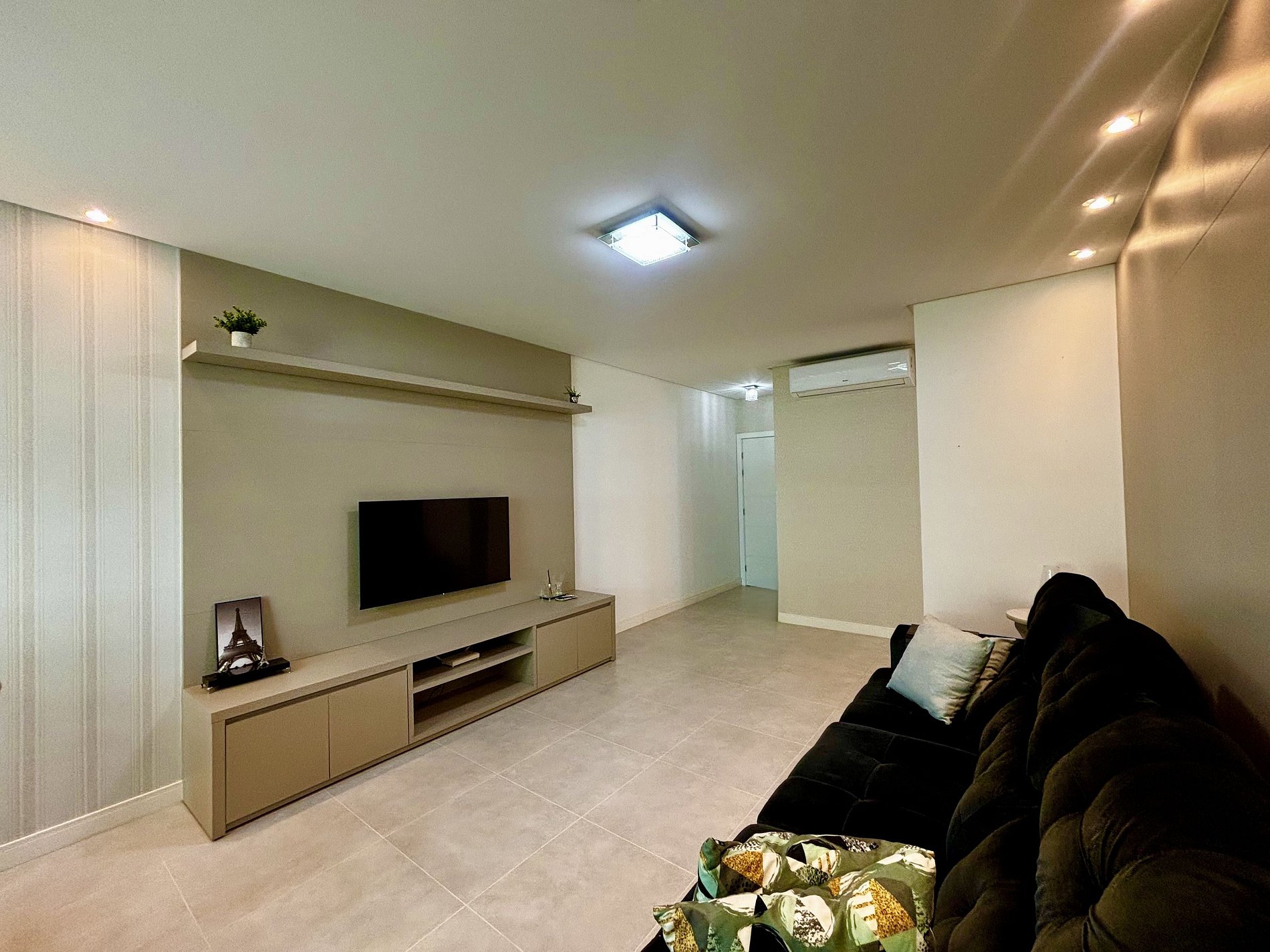 - Sala de estar com sofá, Smart TV e ar-condicionado;
