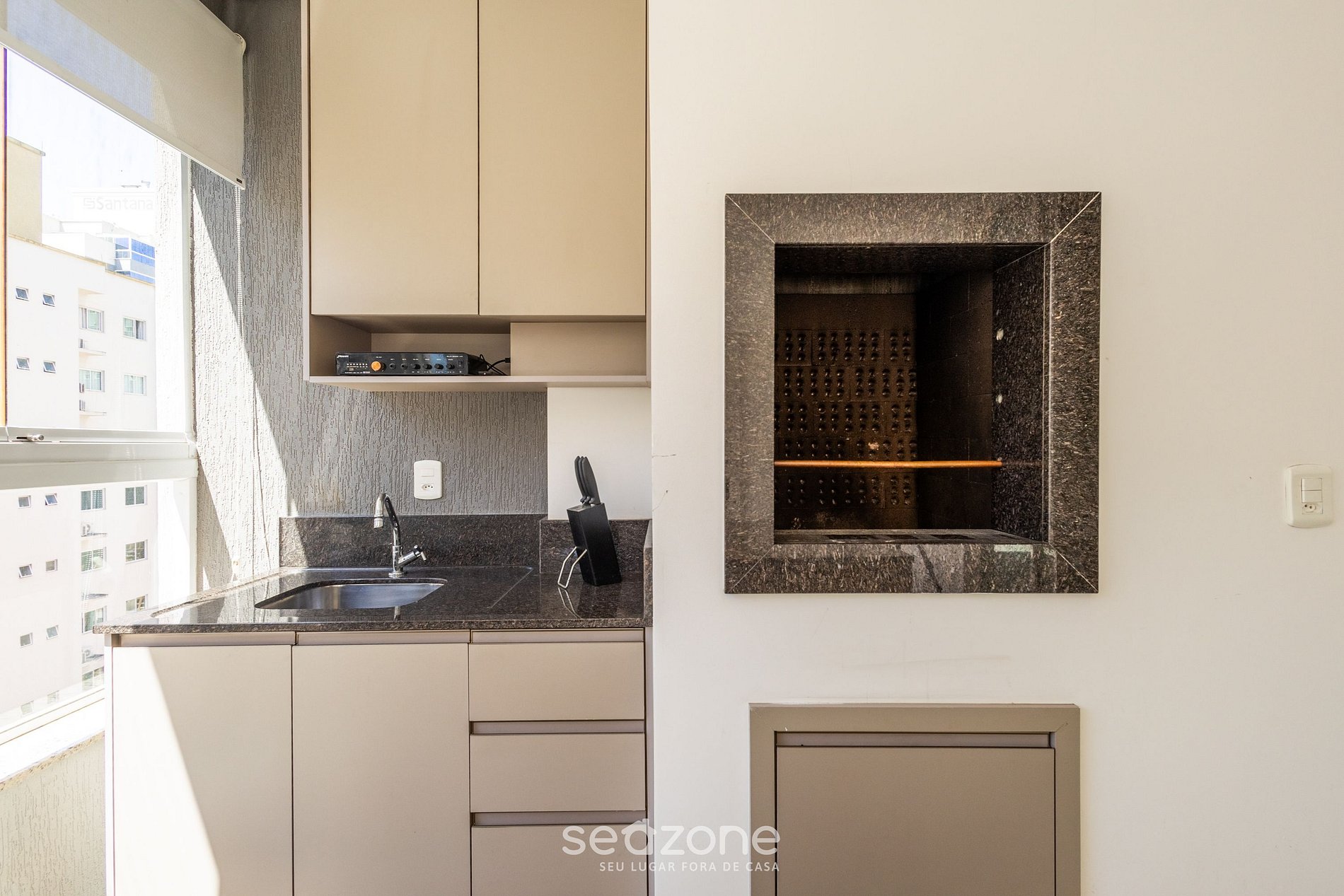 - Varanda gourmet com churrasqueira, móveis e vista para a cidade;