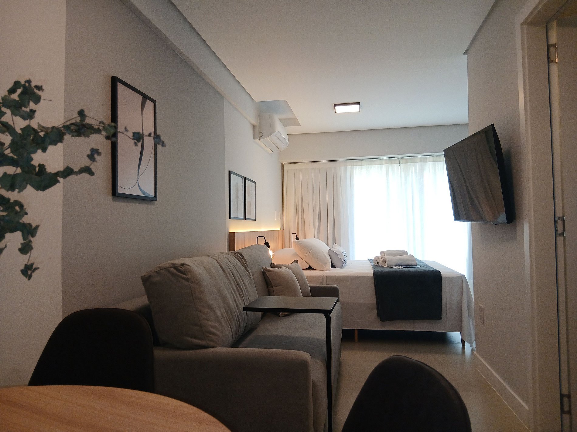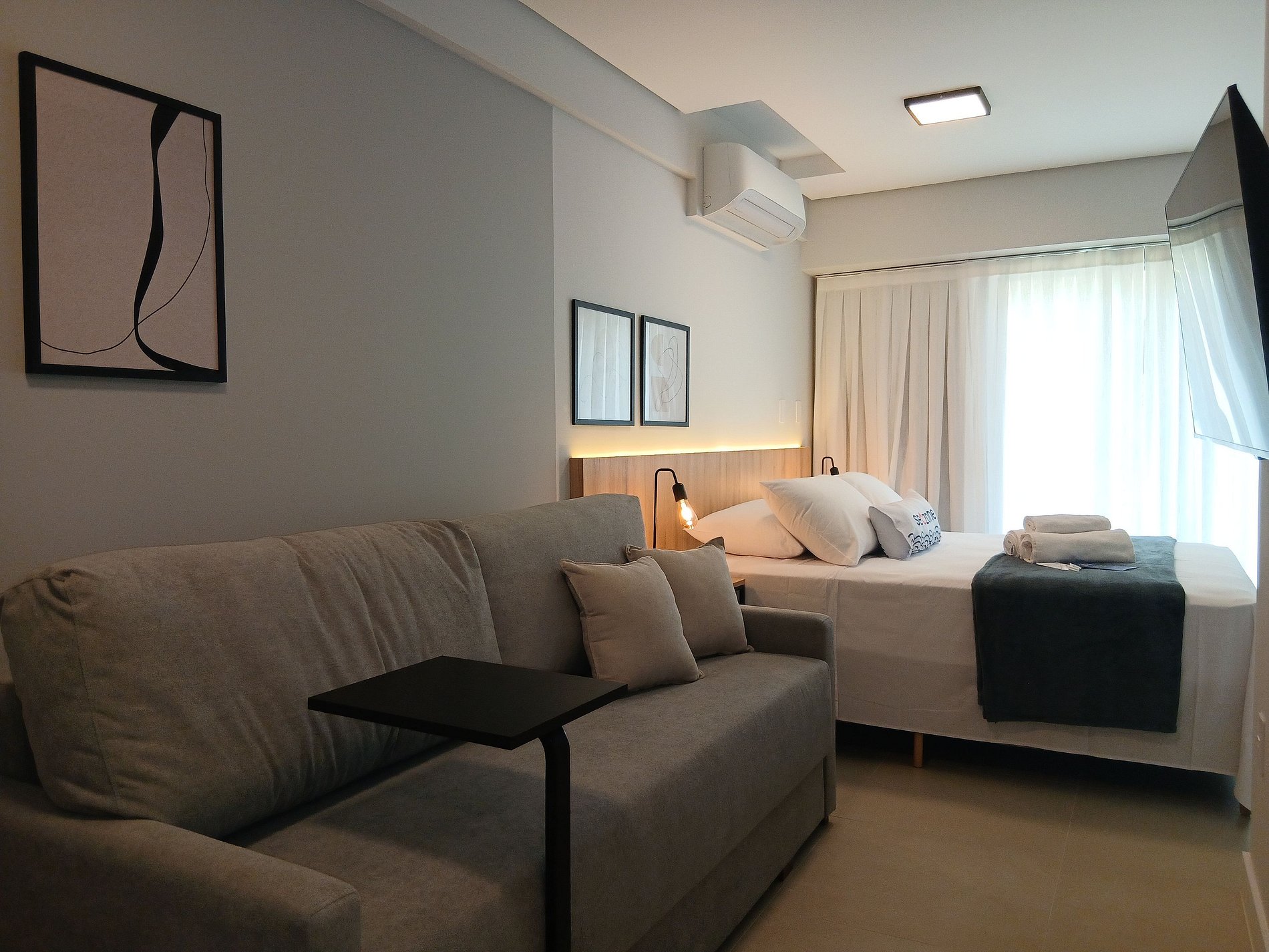 - Cama queen size, sofá-cama de casal, arara para roupas, Smart TV e ar-condicionado;