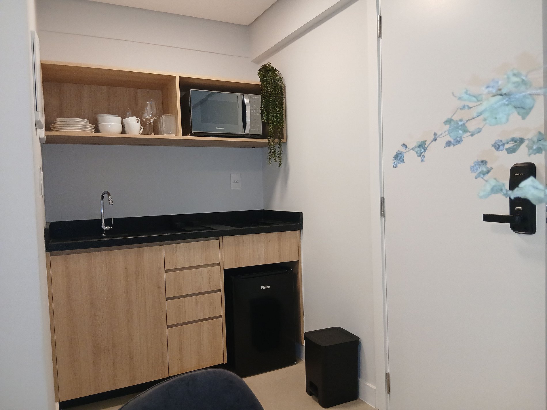 - Cozinha completa com frigobar, cooktop por indução, micro-ondas, sanduicheira, cafeteira elétrica, chaleira elétrica, liquidificador, taças de vinho, panelas, louças e utensílios;