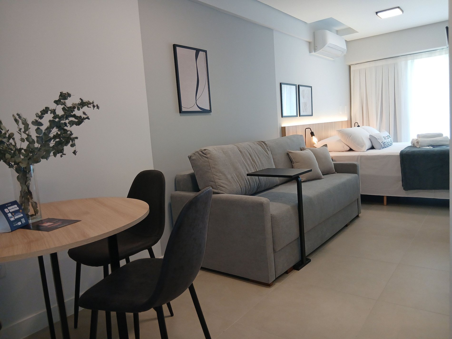 Studio moderno e bem planejado, com cama queen, sofá-cama, Smart TV e ar-condicionado. A cozinha completa garante autonomia durante a estadia, enquanto a sacada adiciona charme ao ambiente. O prédio conta com piscina com borda infinita e espaço gourmet no rooftop. A poucos minutos da Lagoa de Ibiraquera, das praias do Rosa e do Surfland, une localização estratégica e excelente estrutura.