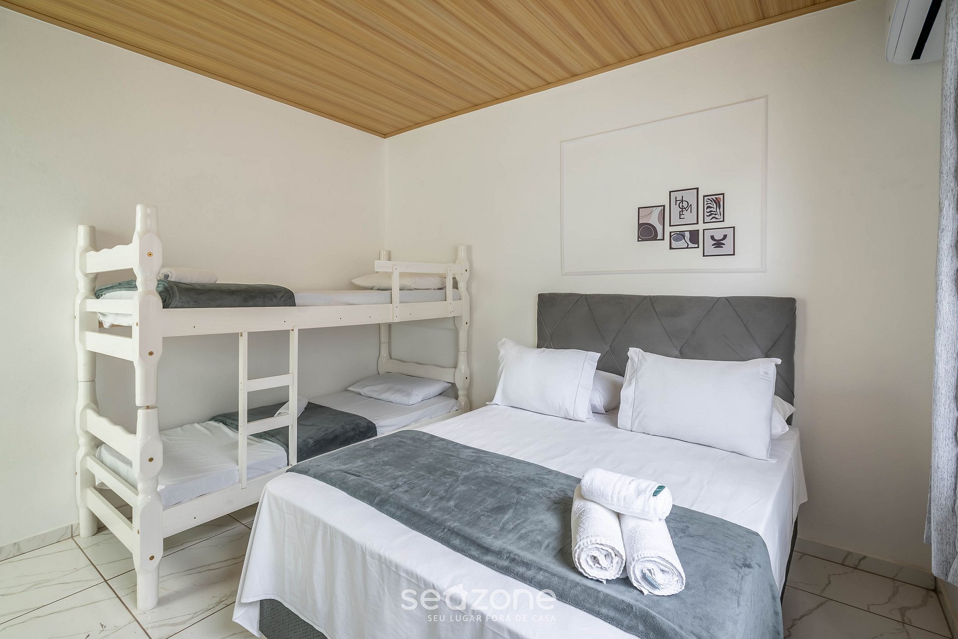 - 1 Quarto com cama de casal, Smart Tv, cômoda, ventilador portátil e ar-condicionado;