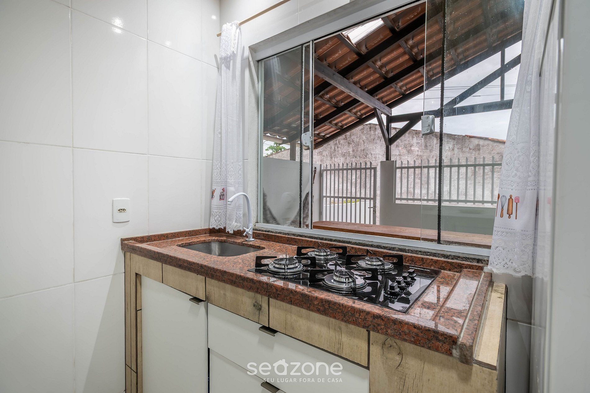 - Cozinha completa com geladeira, fogão cooktop (gás), forno elétrico, micro-ondas, sanduicheira, cafeteira elétrica, chaleira elétrica, liquidificador, louças e utensílios;