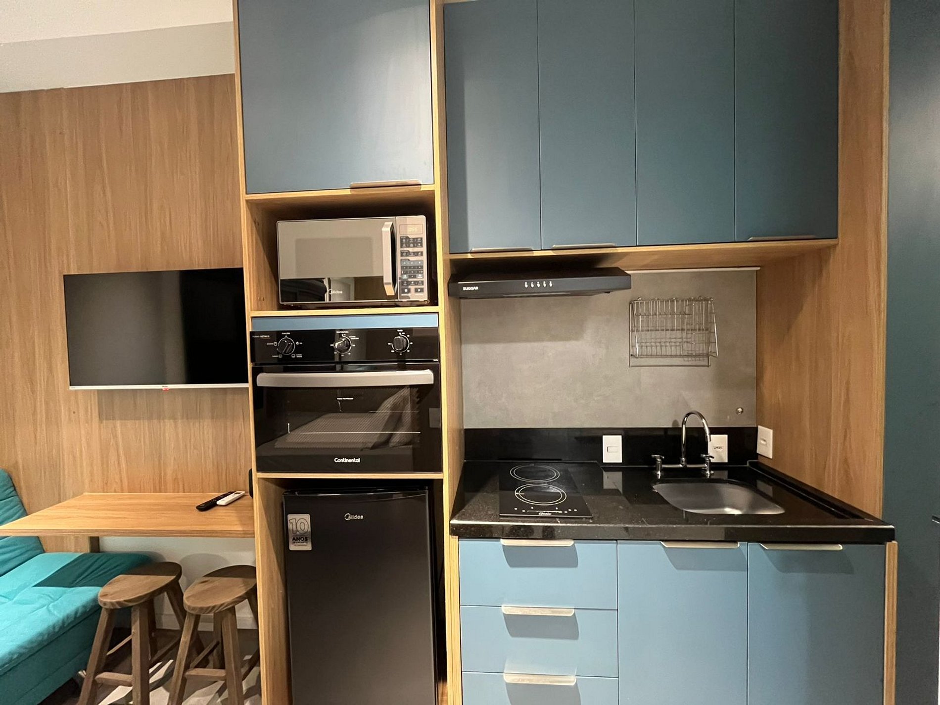 - Cozinha completa com frigobar, fogão cooktop por indução, forno elétrico, micro-ondas, sanduicheira, cafeteira elétrica, chaleira, liquidificador, taças de vinho, panelas, louças e utensílios;