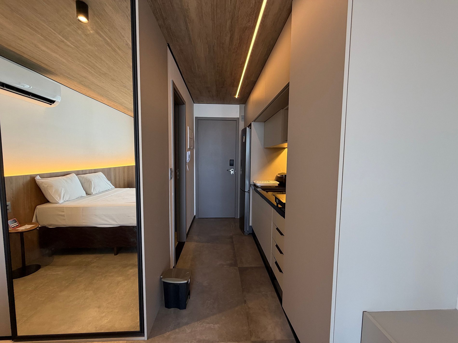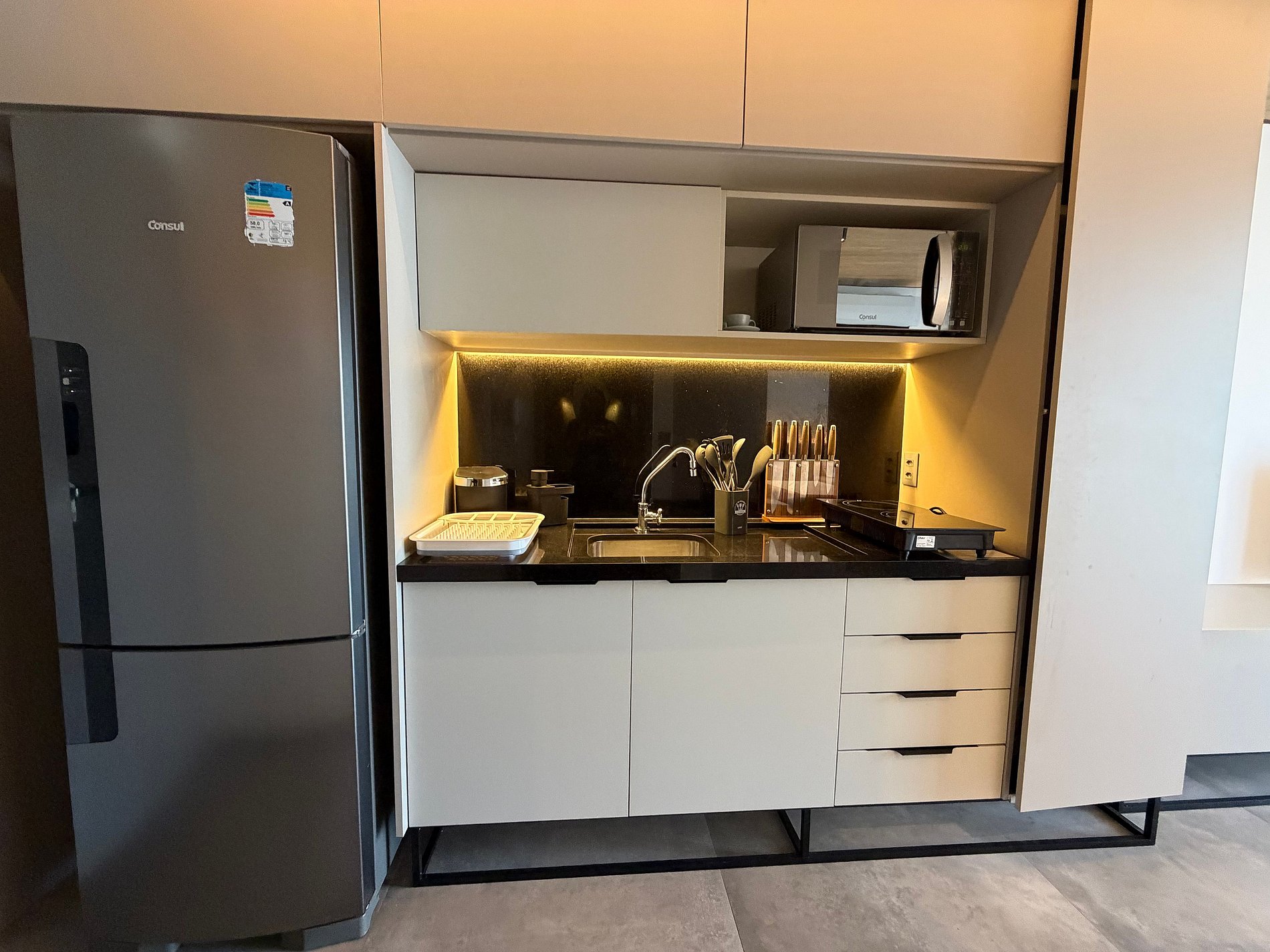 - Cozinha com mini geladeira, fogão cooktop (indução), cafeteira elétrica, chaleira elétrica, sanduicheira, microondas, liquidificador, panelas, louças e utensílios;