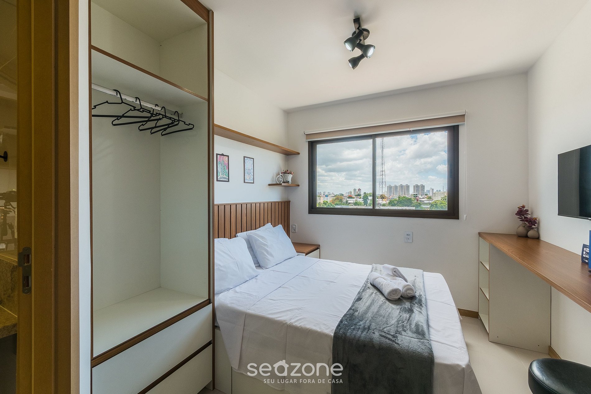 - 1 cama de casal, Smart Tv, armário, arara para roupas e ar-condicionado;