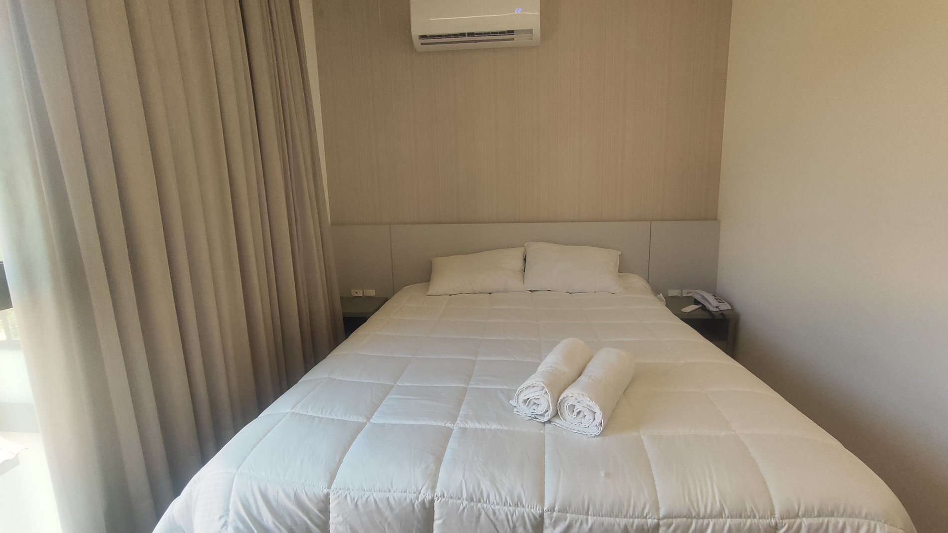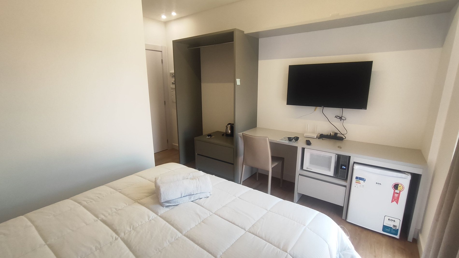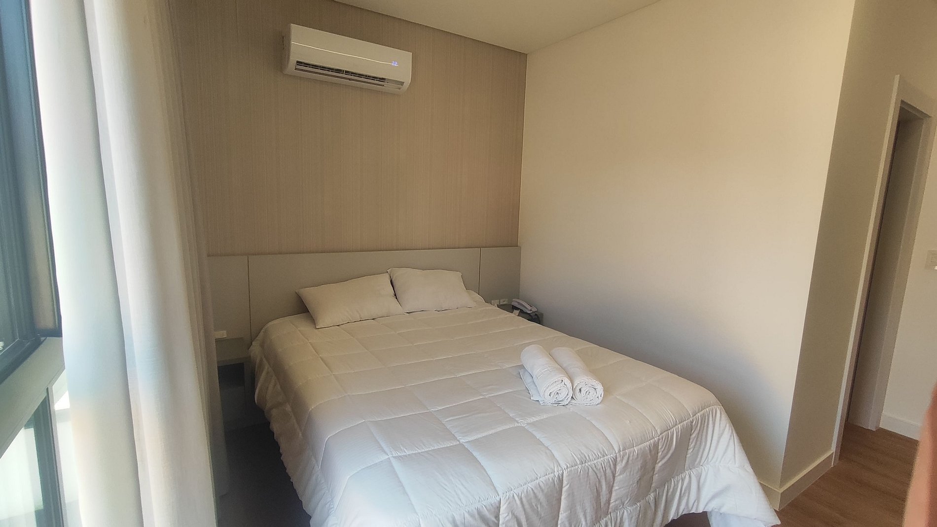 - 1 cama queen, Smart Tv, arara para roupas e ar-condicionado;