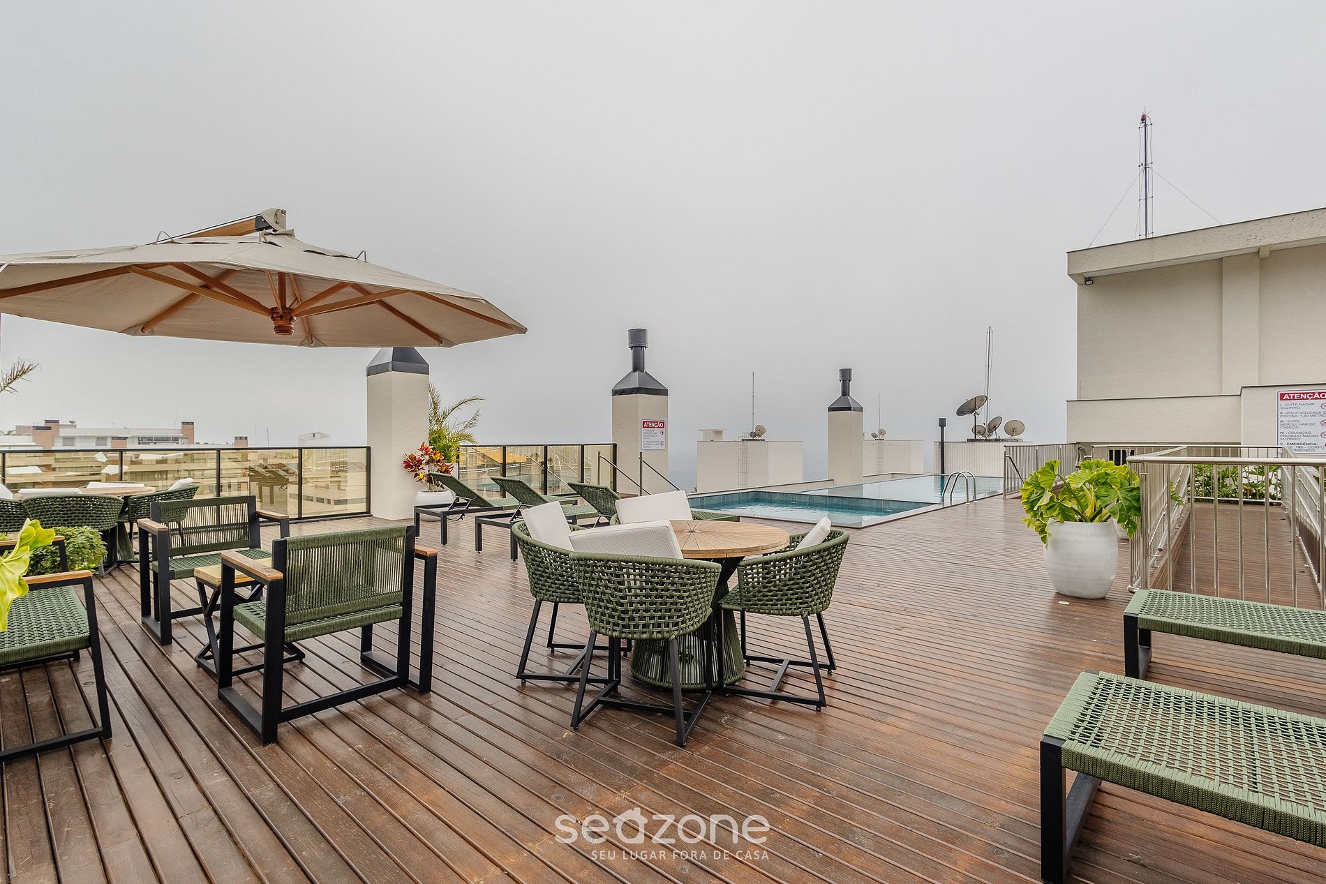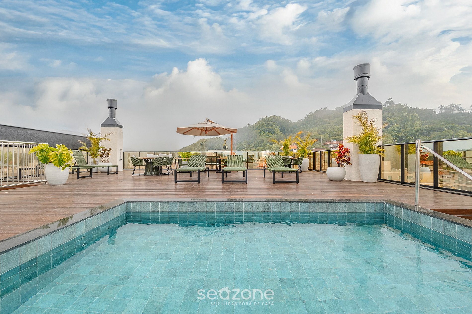 - Áreas comuns do prédio com: piscina no rooftop com vista para o mar.