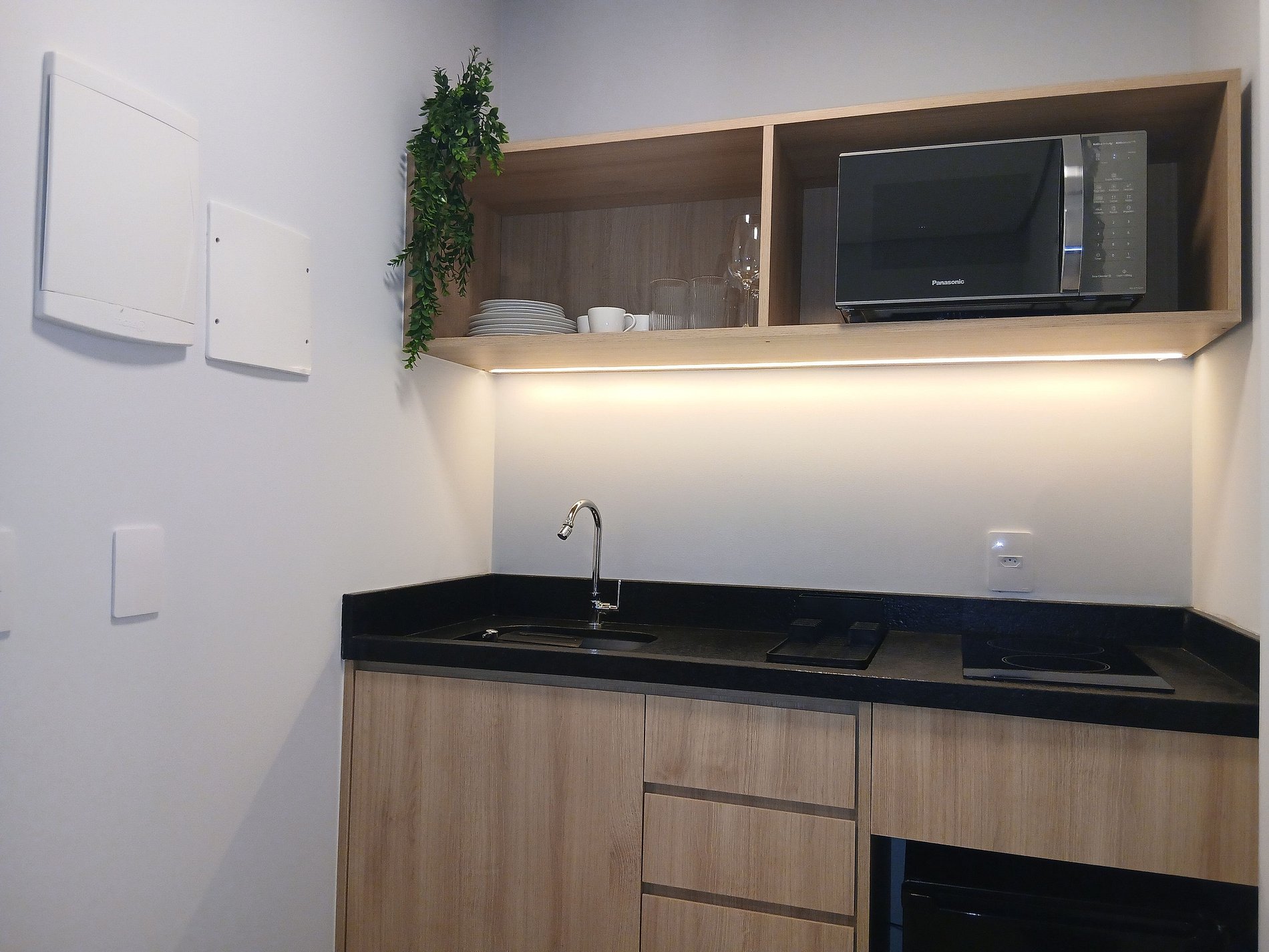 - Cozinha completa com frigobar, cooktop por indução, micro-ondas, sanduicheira, cafeteira elétrica, chaleira elétrica, taças de vinho, panelas, louças e utensílios;