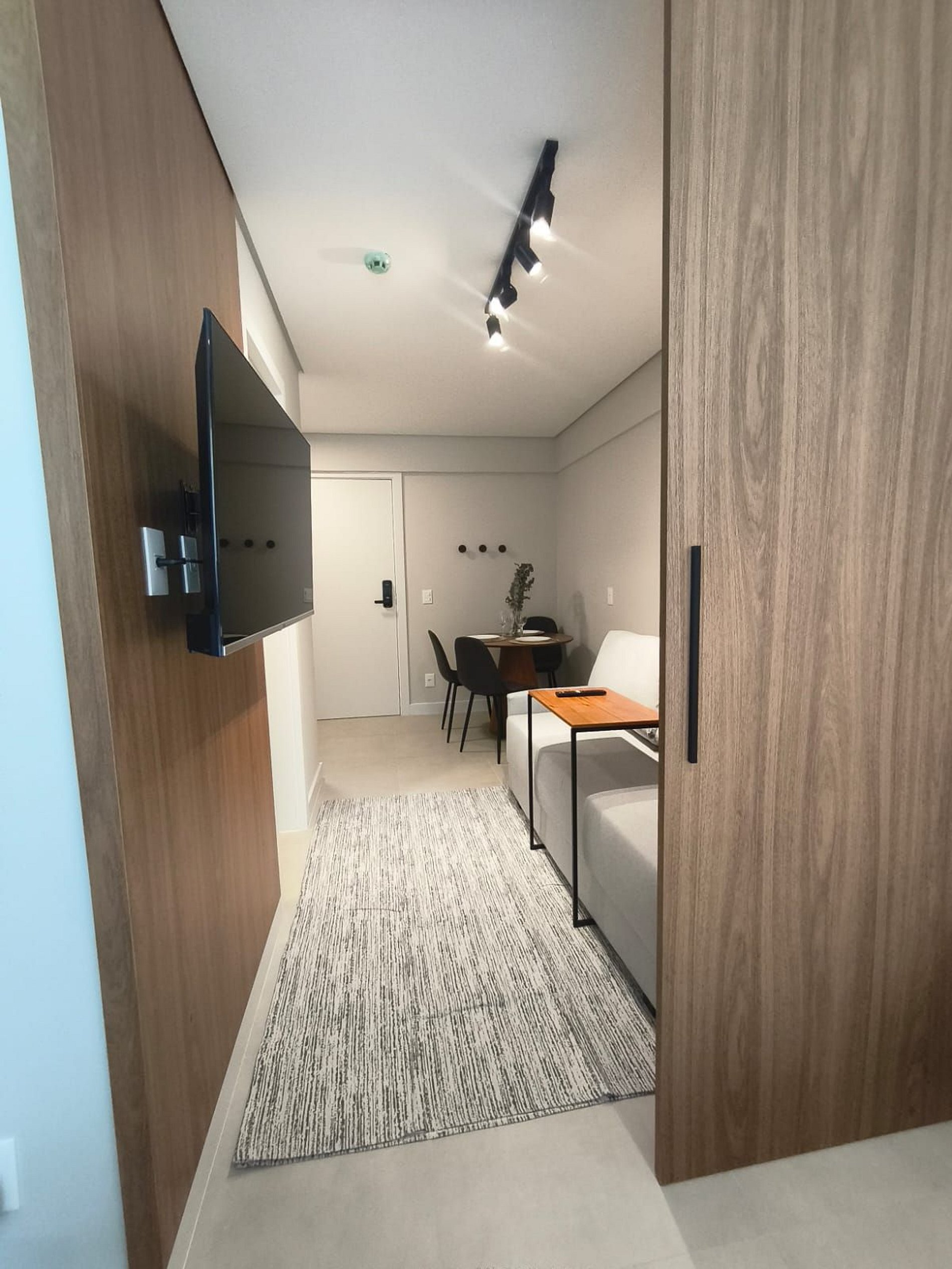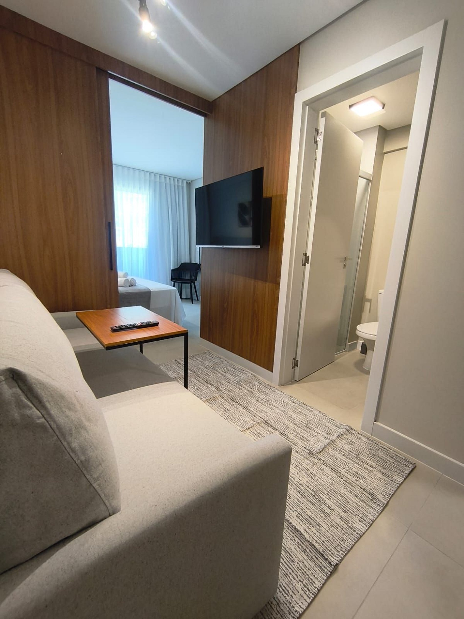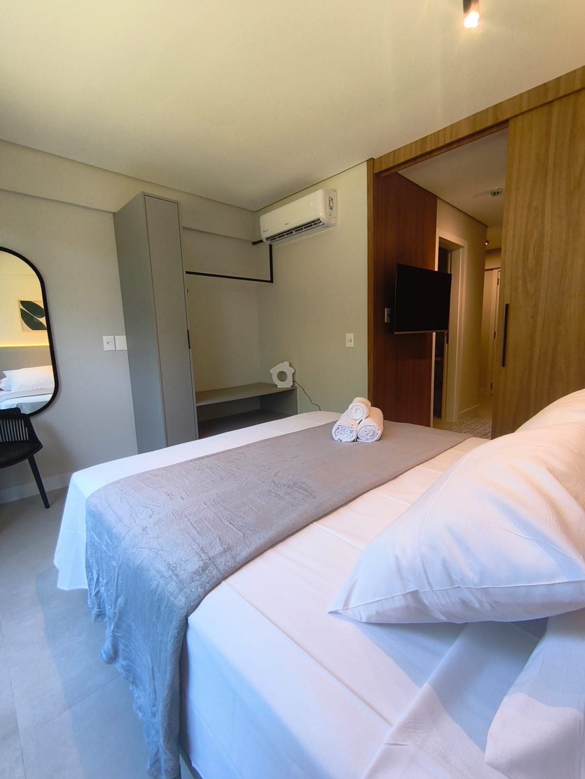 Studio moderno com cama queen, sofá-cama, ar-condicionado, Smart TV e Wi-Fi. A cozinha completa e o espaço para refeições garantem conforto no dia a dia, enquanto a sacada traz leveza ao ambiente. O prédio oferece rooftop com piscina de borda infinita e espaço gourmet. Localização estratégica entre praias renomadas, lagoa de Ibiraquera e o Surfland.