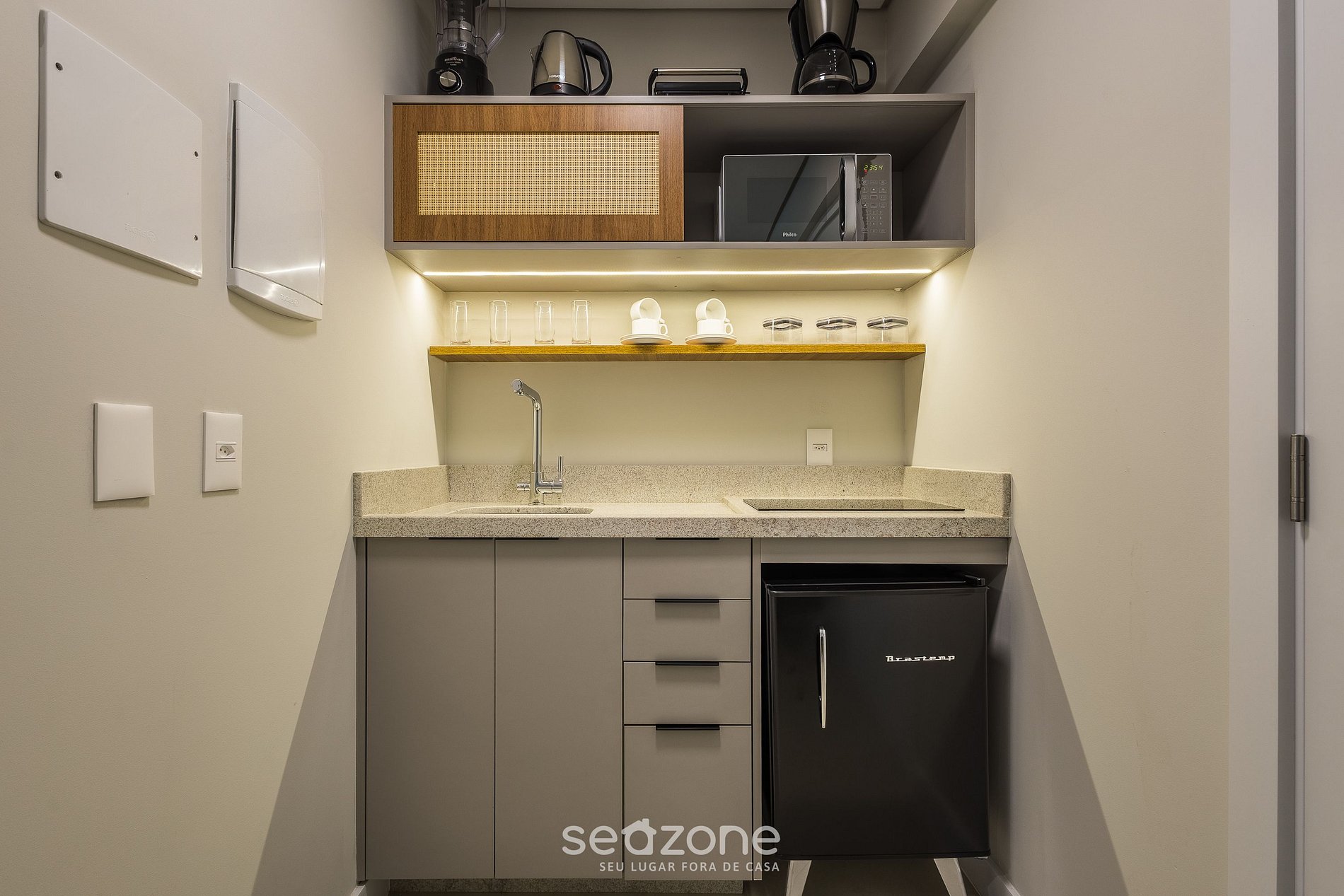 - Cozinha completa com frigobar, cooktop por indução, micro-ondas, sanduicheira, cafeteira elétrica, chaleira, liquidificador, taças de vinho, panelas, louças e utensílios;
