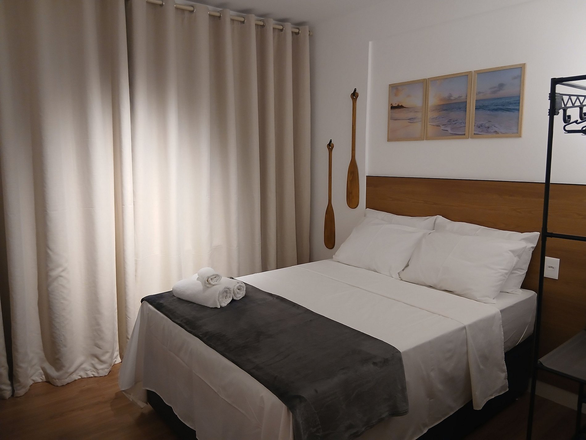 - Cama de casal, arara para roupas, Smart TV e ar-condicionado;