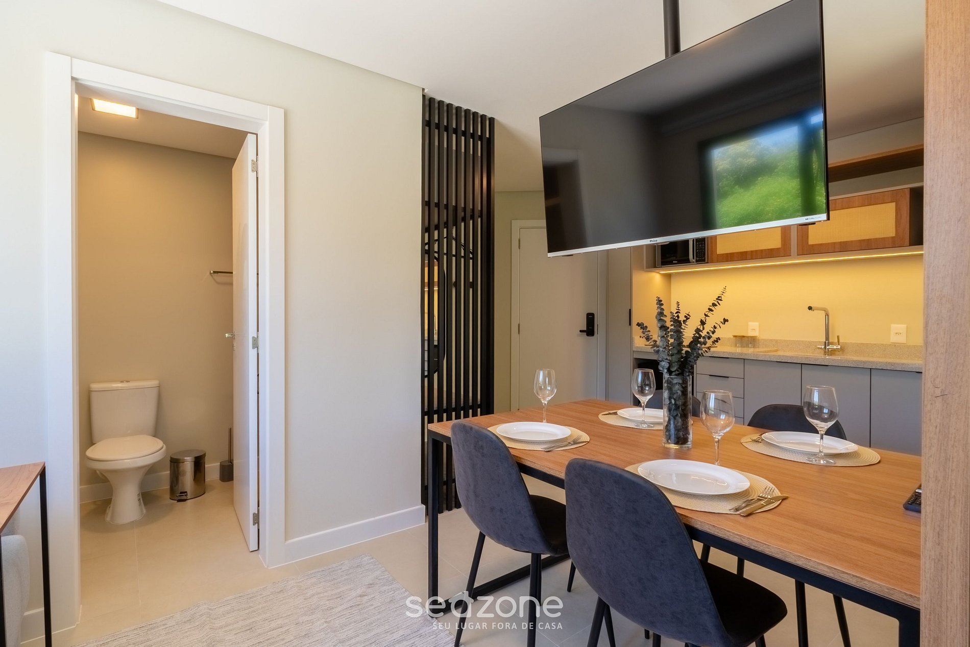 - Espaço para jantar com mesa e 4 cadeiras;