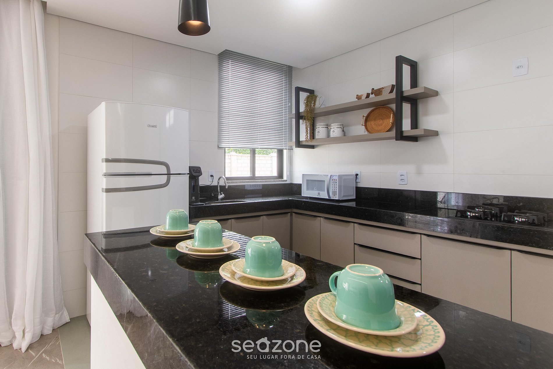 - Cozinha completa com geladeira, fogão cooktop a gás, micro-ondas, airfryer, sanduicheira, cafeteira elétrica, liquidificador, taças de vinho, panelas, louças e utensílios;