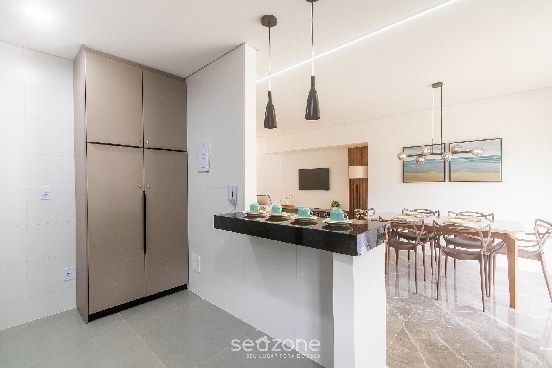 - Espaço para jantar com mesa e 6 cadeiras;
