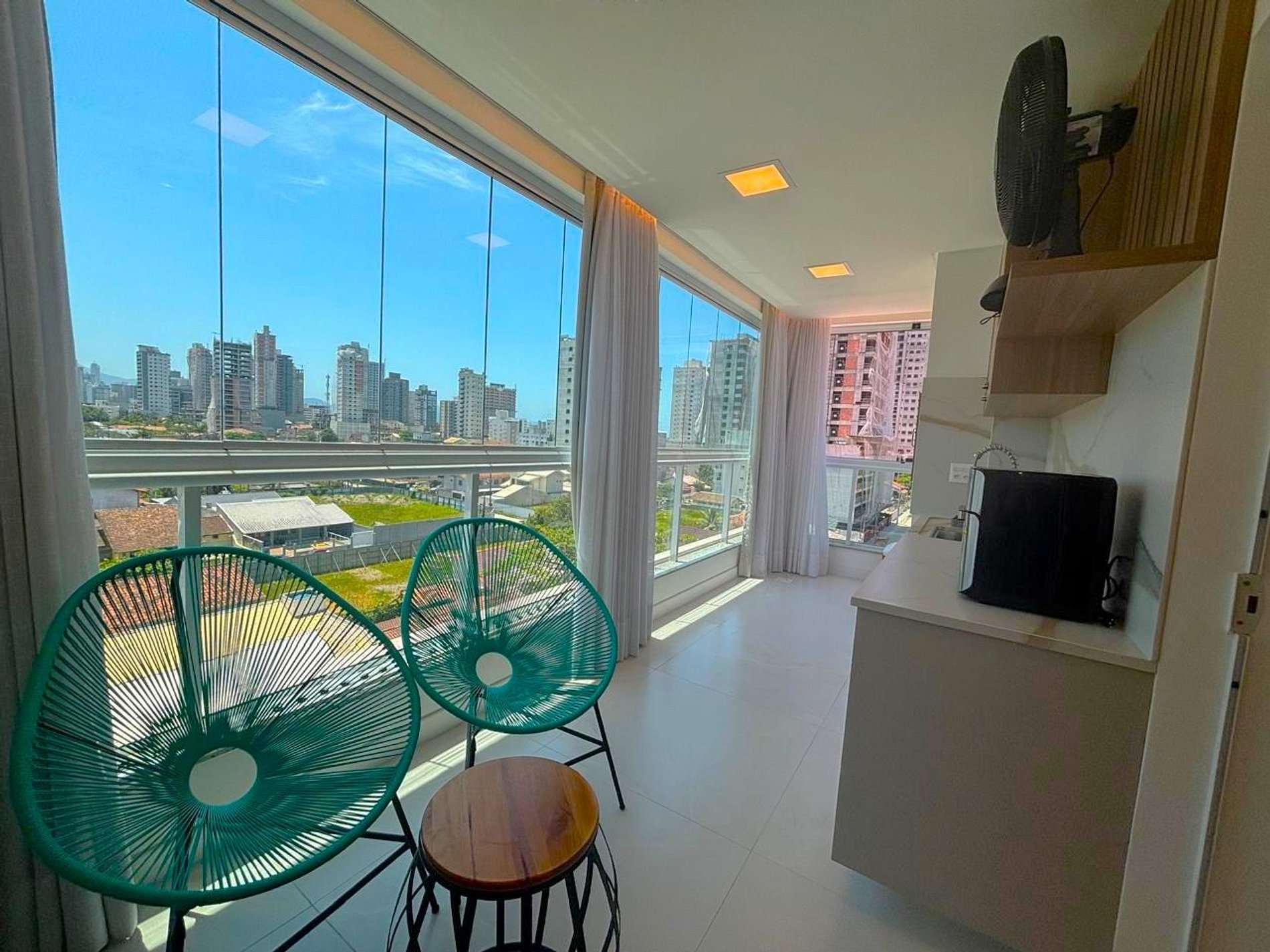 - Varanda gourmet com churrasqueira, frigobar, móveis externos e vista para a cidade e parcial para o mar;