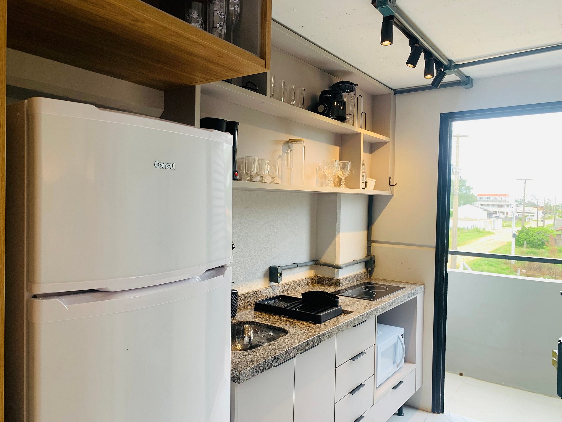 - Cozinha completa com geladeira, fogão cooktop, micro-ondas, sanduicheira, cafeteira elétrica, chaleira elétrica, liquidificador, panelas, louças e utensílios;