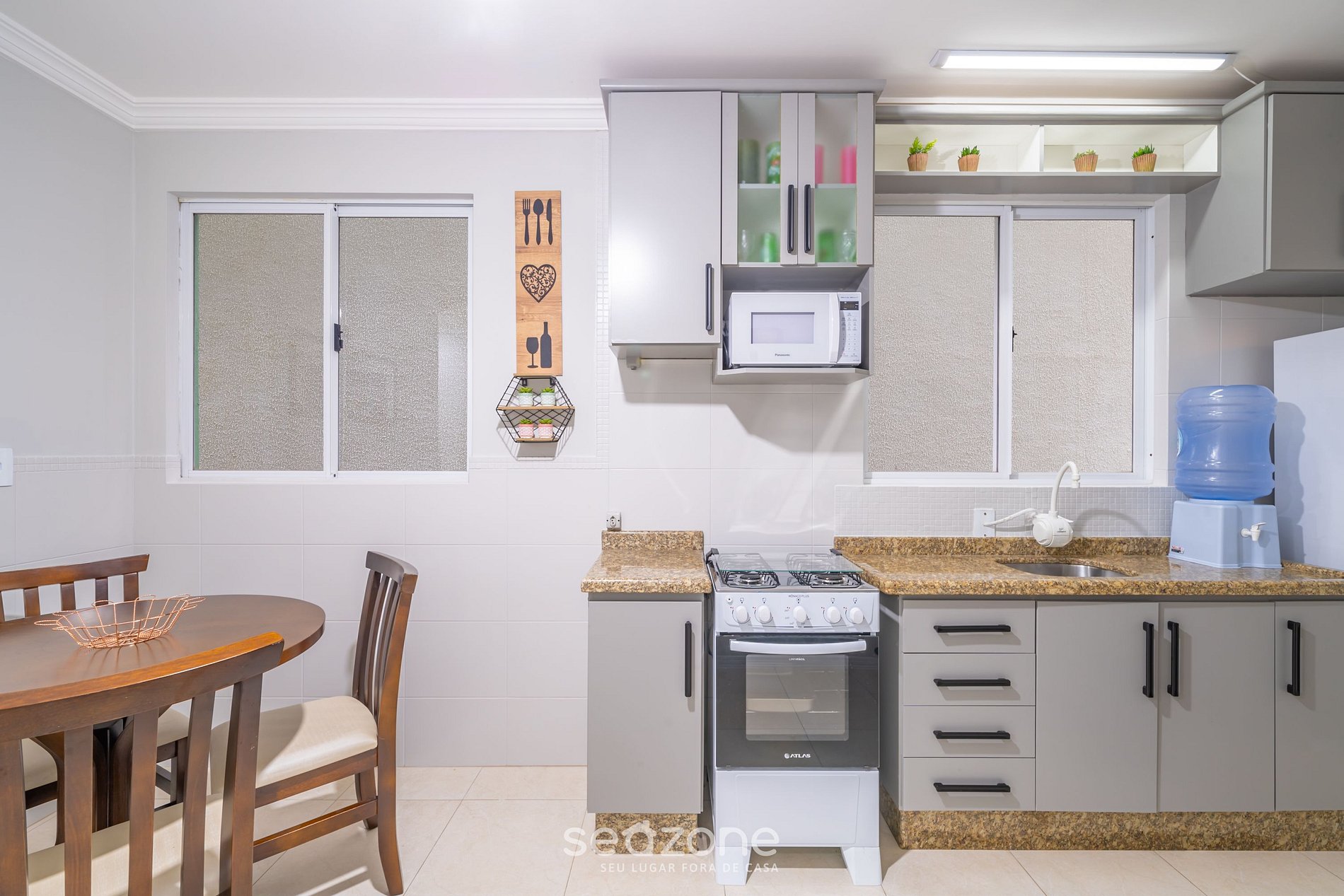 - Cozinha completa com geladeira, fogão, forno, micro-ondas, sanduicheira, chaleira elétrica, liquidificador, panelas, louças e utensílios;