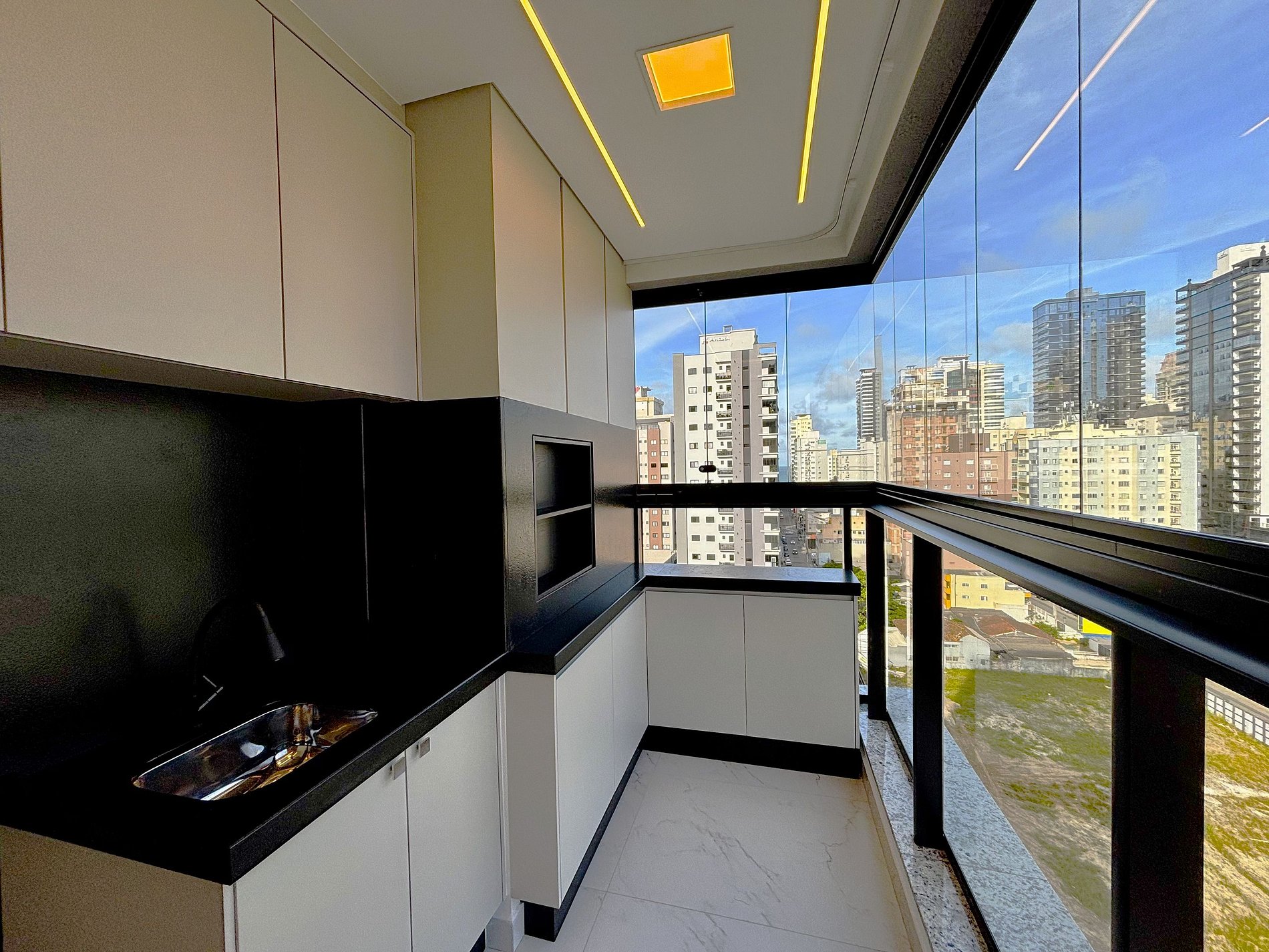 - Varanda gourmet privativa com churrasqueira, móveis externos e vista urbana;