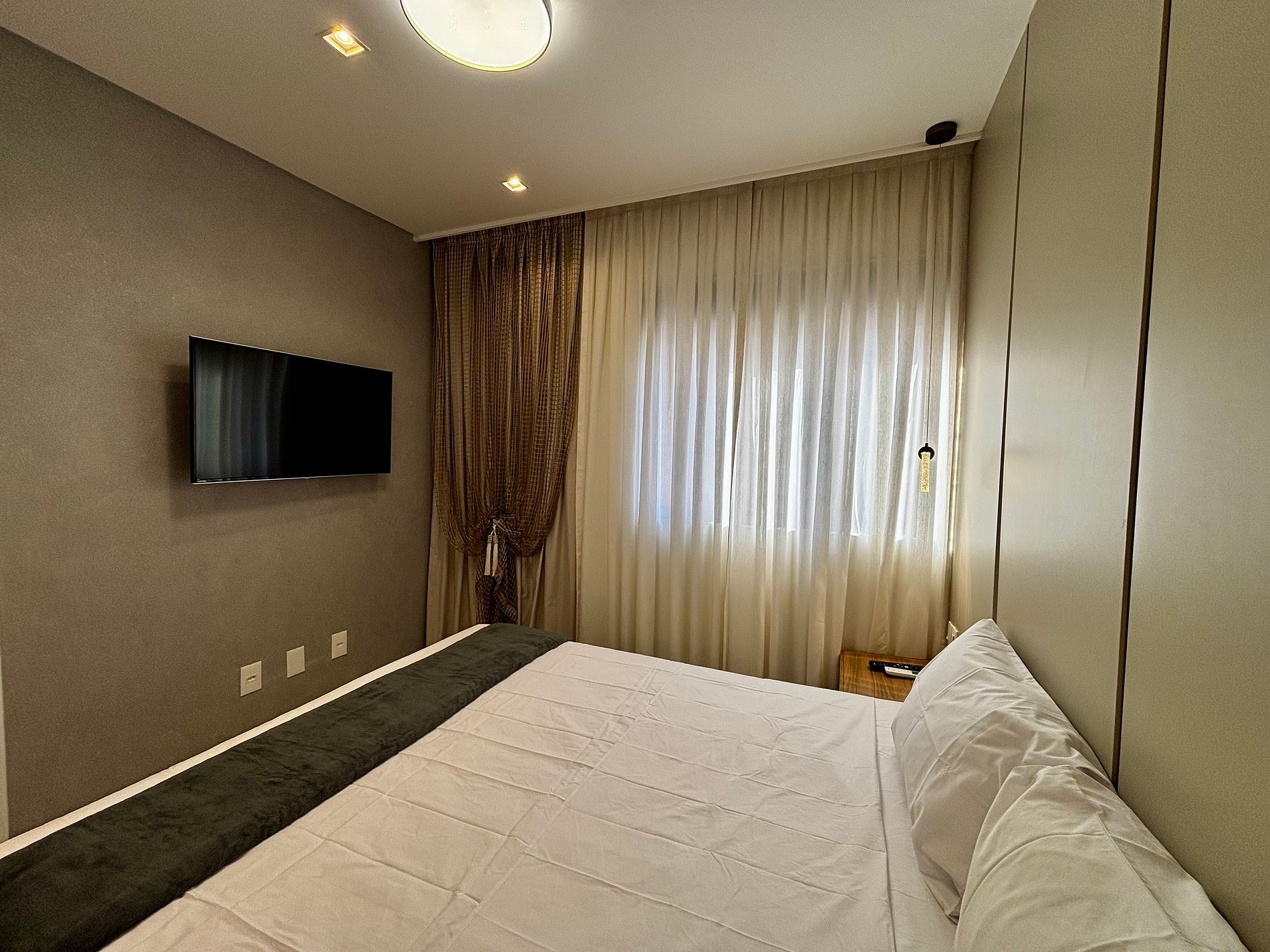 - 1 Suíte com cama queen, Smart Tv, arara para roupas, armário e ar-condicionado;