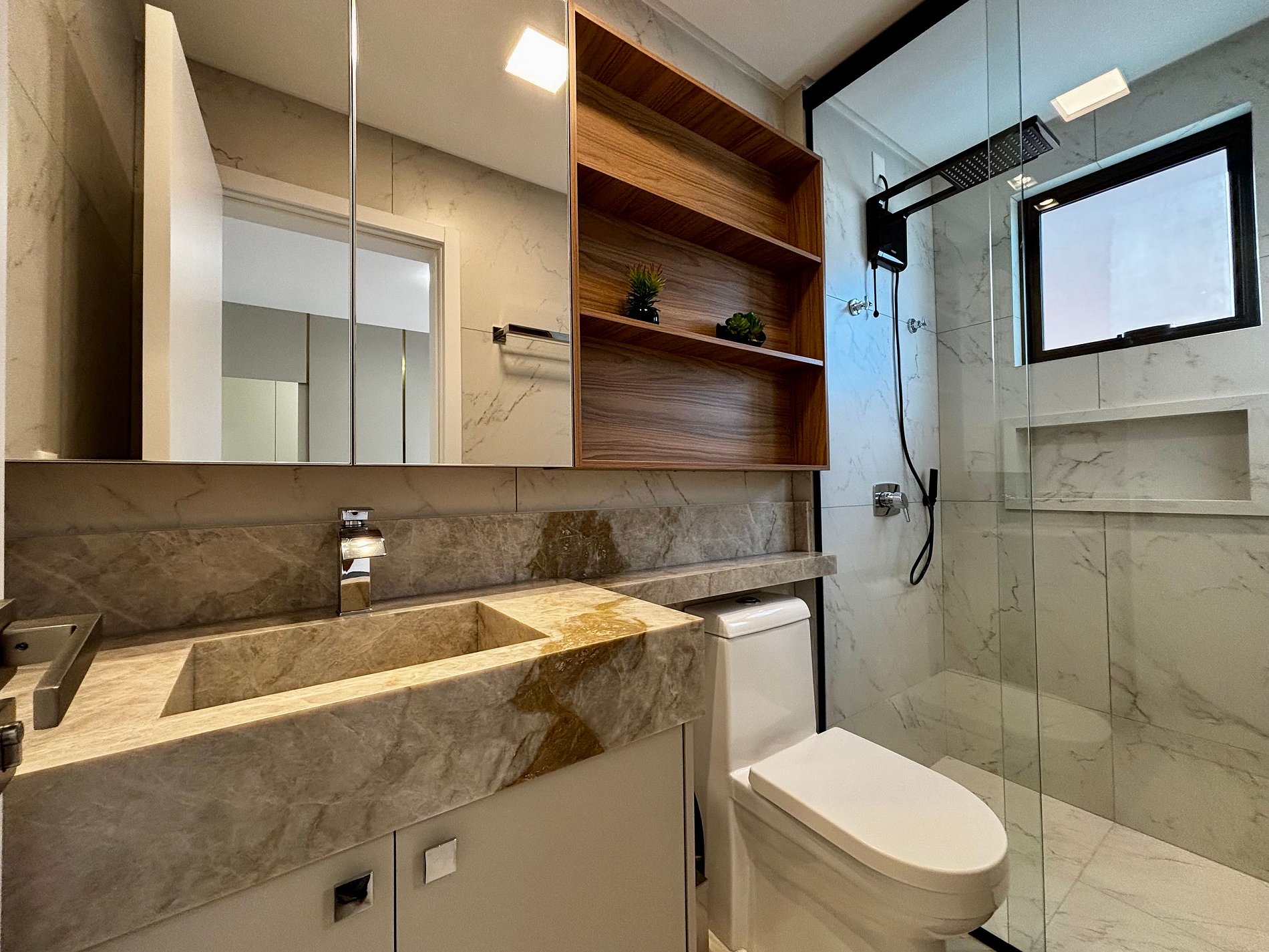 - 1 Suíte com cama queen, armário e ar-condicionado;