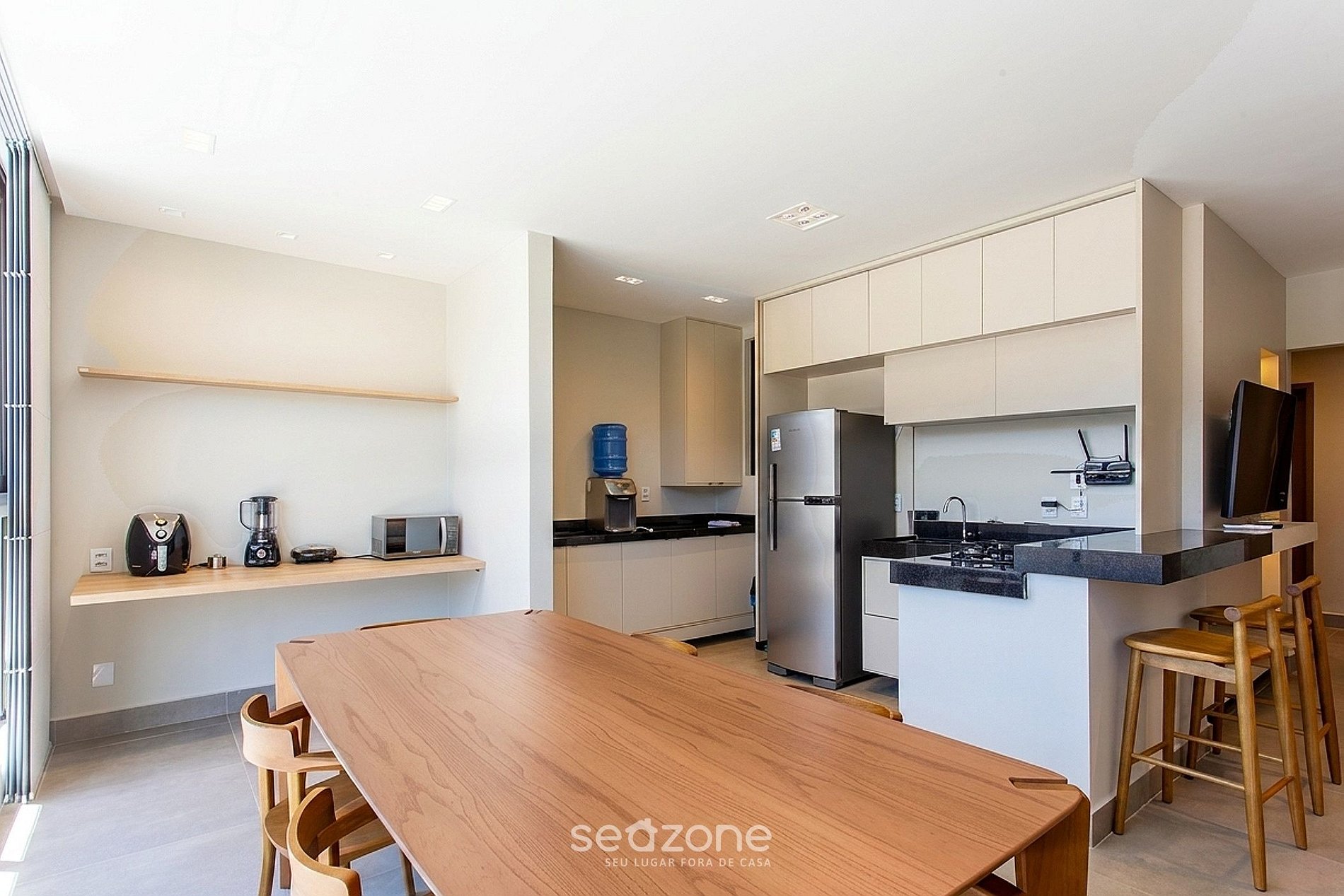 - Cozinha completa com geladeira, freezer, fogão cooktop, forno elétrico, micro-ondas, sanduicheira, kit café, airfryer, liquidificador, louças e utensílios;
