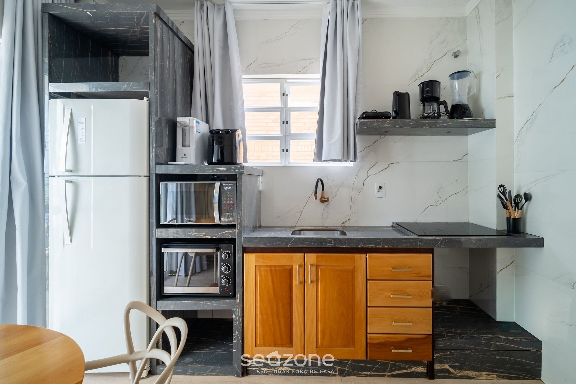- Cozinha completa com geladeira, fogão cooktop por indução, forno elétrico, Airfryer, microondas, sanduicheira, cafeteira elétrica, chaleira elétrica, liquidificador, taças de vinho, panelas, louças e utensílios;