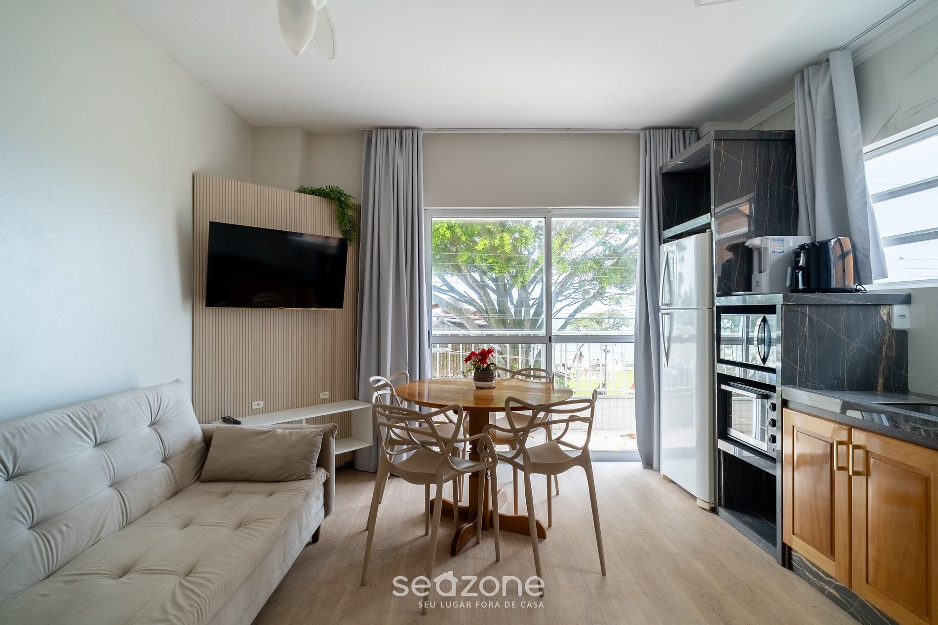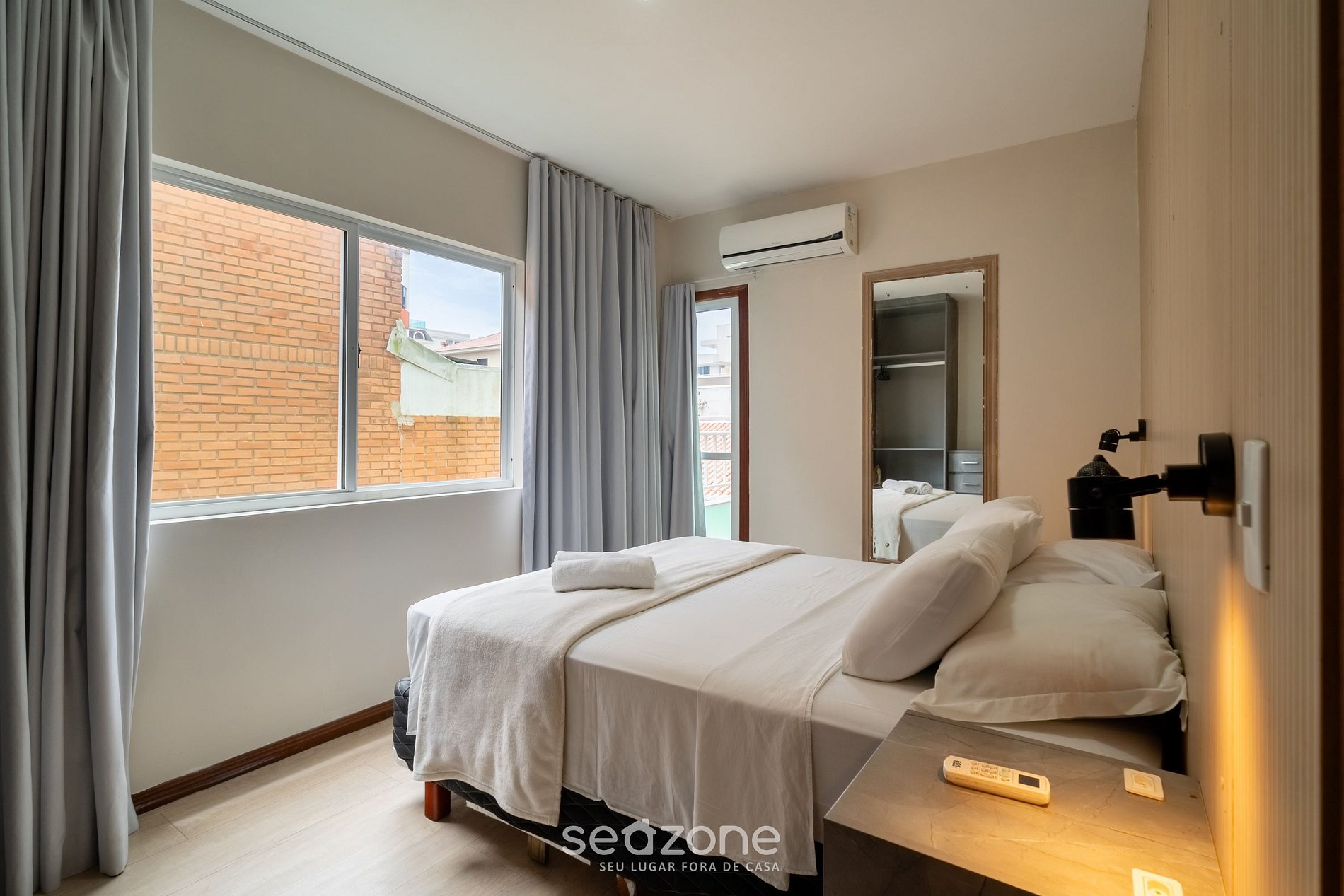 Este apartamento beira-mar em Canasvieiras oferece uma estadia elegante e funcional. Dispõe de suíte com cama queen e ar-condicionado, sala com sofá-cama e Smart TV, além de cozinha completa para o dia a dia. A varanda com churrasqueira e vista direta para o mar é um dos grandes destaques. Localização estratégica, próxima à orla, mercados, padarias e restaurantes.