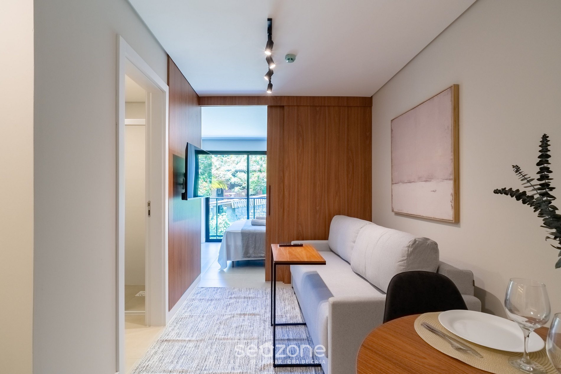 - Cama queen size, sofá-cama de casal, arara para roupas, Smart TV e ar-condicionado;