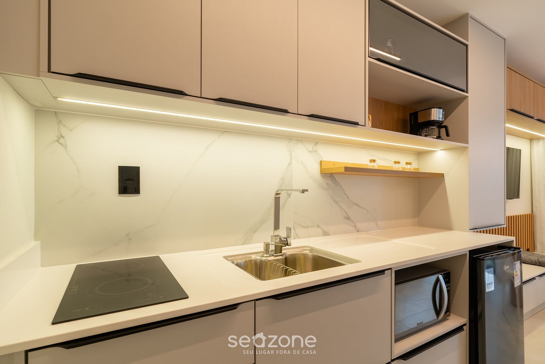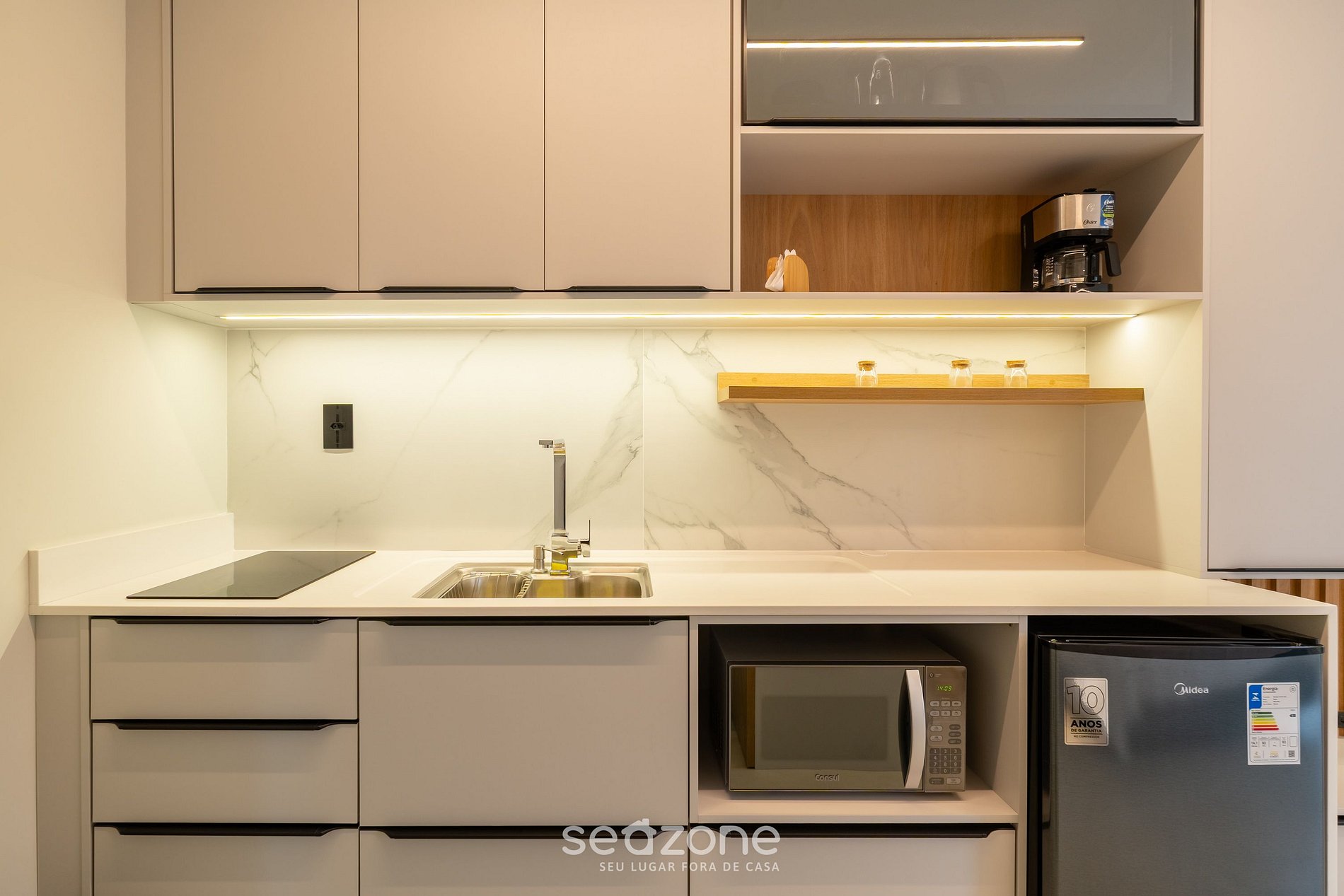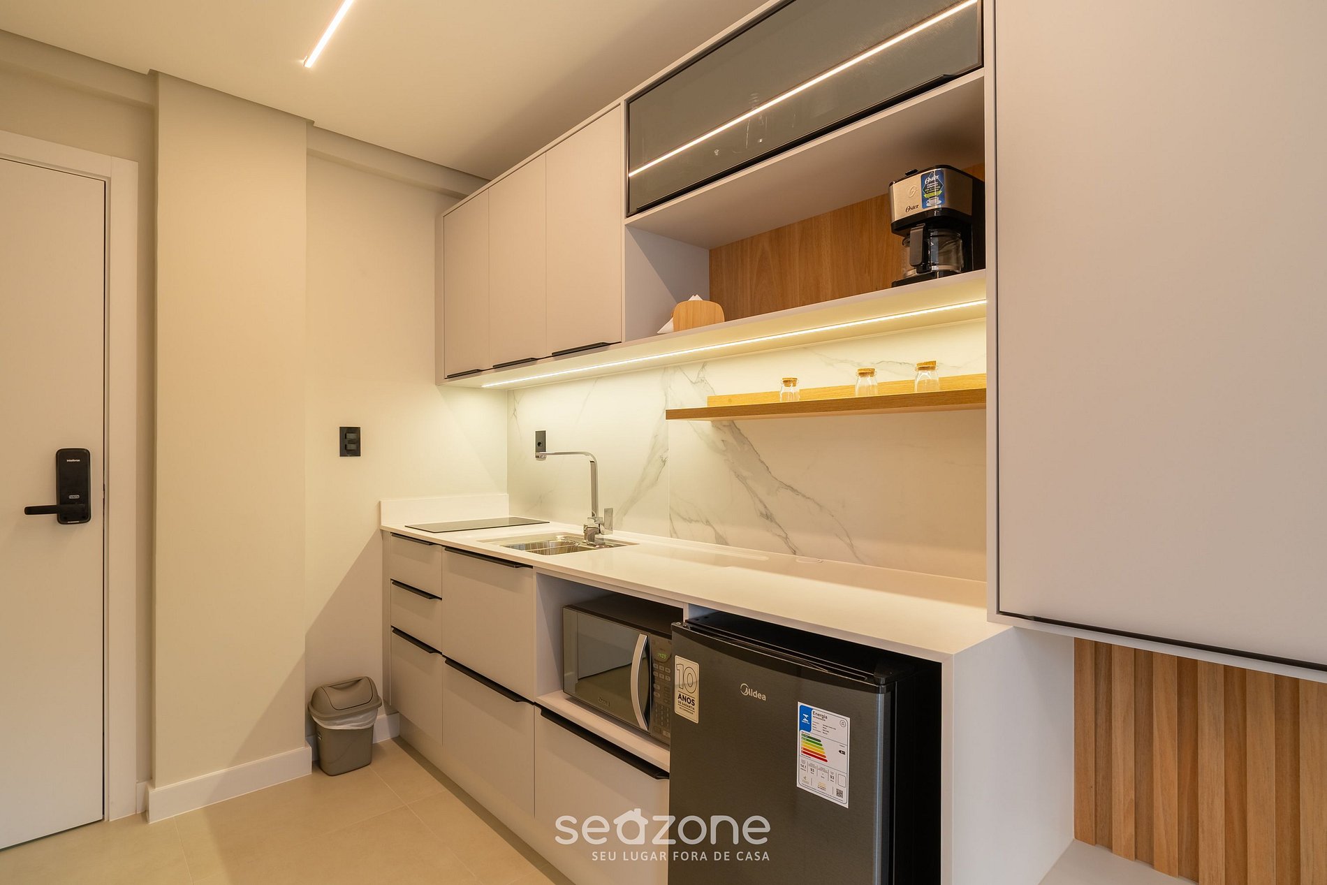 - Cozinha completa com frigobar, cooktop por indução, micro-ondas, sanduicheira, cafeteira elétrica, chaleira elétrica, liquidificador, taças de vinho, panelas, louças e utensílios;