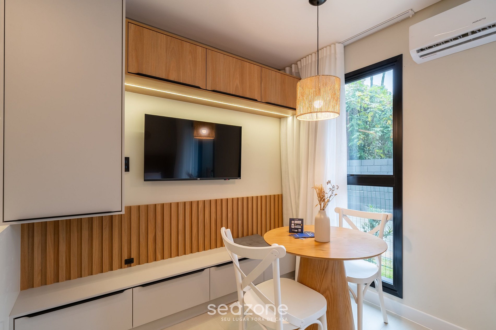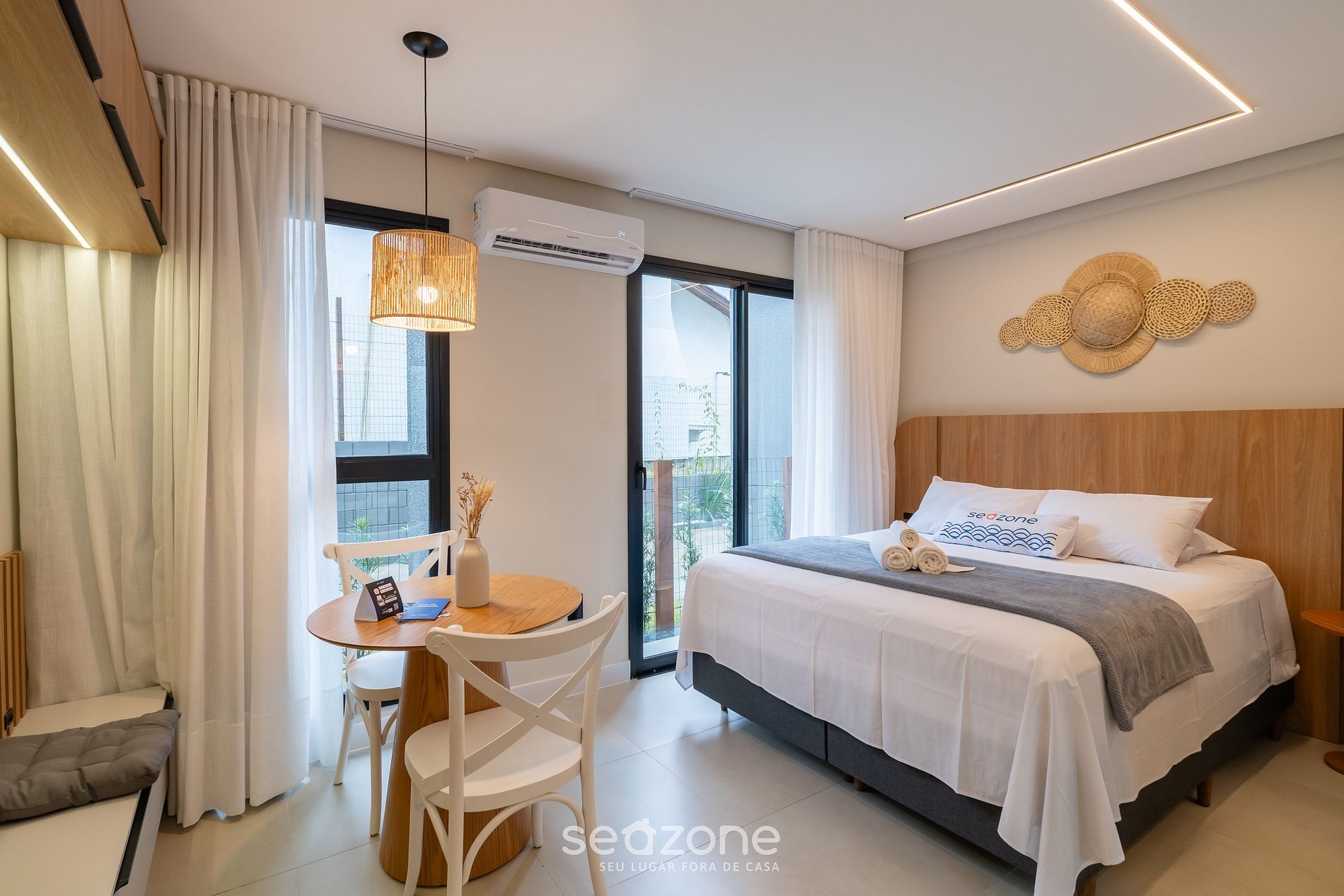 Equipado com cama queen, ar-condicionado, Smart TV, Wi-Fi e cozinha funcional com eletros e utensílios. Sacada e banheiro social complementam o espaço. O prédio conta com rooftop com piscina de borda infinita e área gourmet. Localização estratégica, com fácil acesso às praias do Rosa e às principais atrações locais.