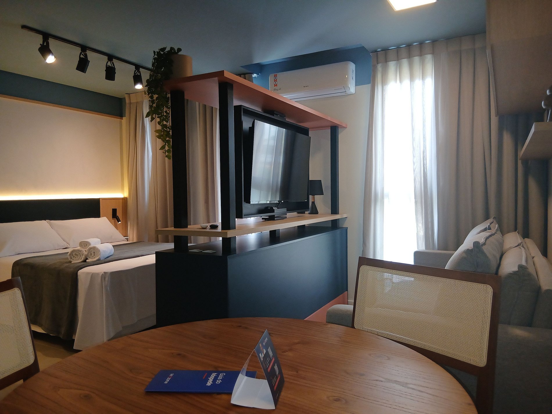 Com layout inteligente, este studio reúne cama de casal, sofá-cama, Smart TV, Wi-Fi, ar-condicionado e cozinha completa. A sacada amplia a sensação de bem-estar. No rooftop, piscina com borda infinita e espaço gourmet valorizam cada momento. Próximo às praias do Rosa, Ibiraquera, lagoa e atrações naturais da região.