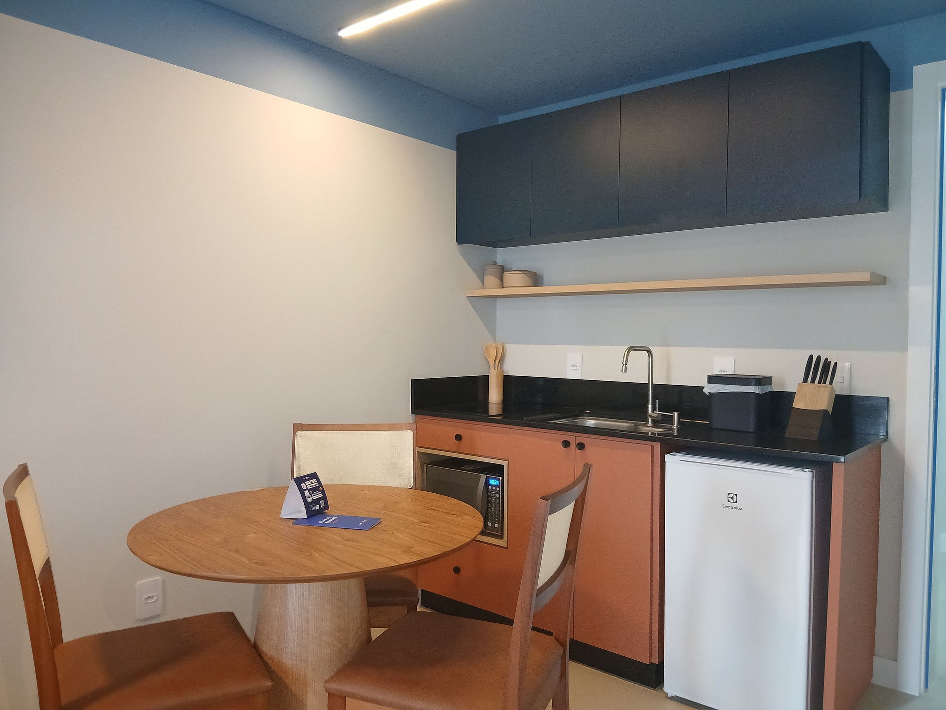 - Cozinha completa com frigobar, cooktop (indução), micro-ondas, sanduicheira, cafeteira elétrica, chaleira, liquidificador, taças de vinho, panelas, louças e utensílios;