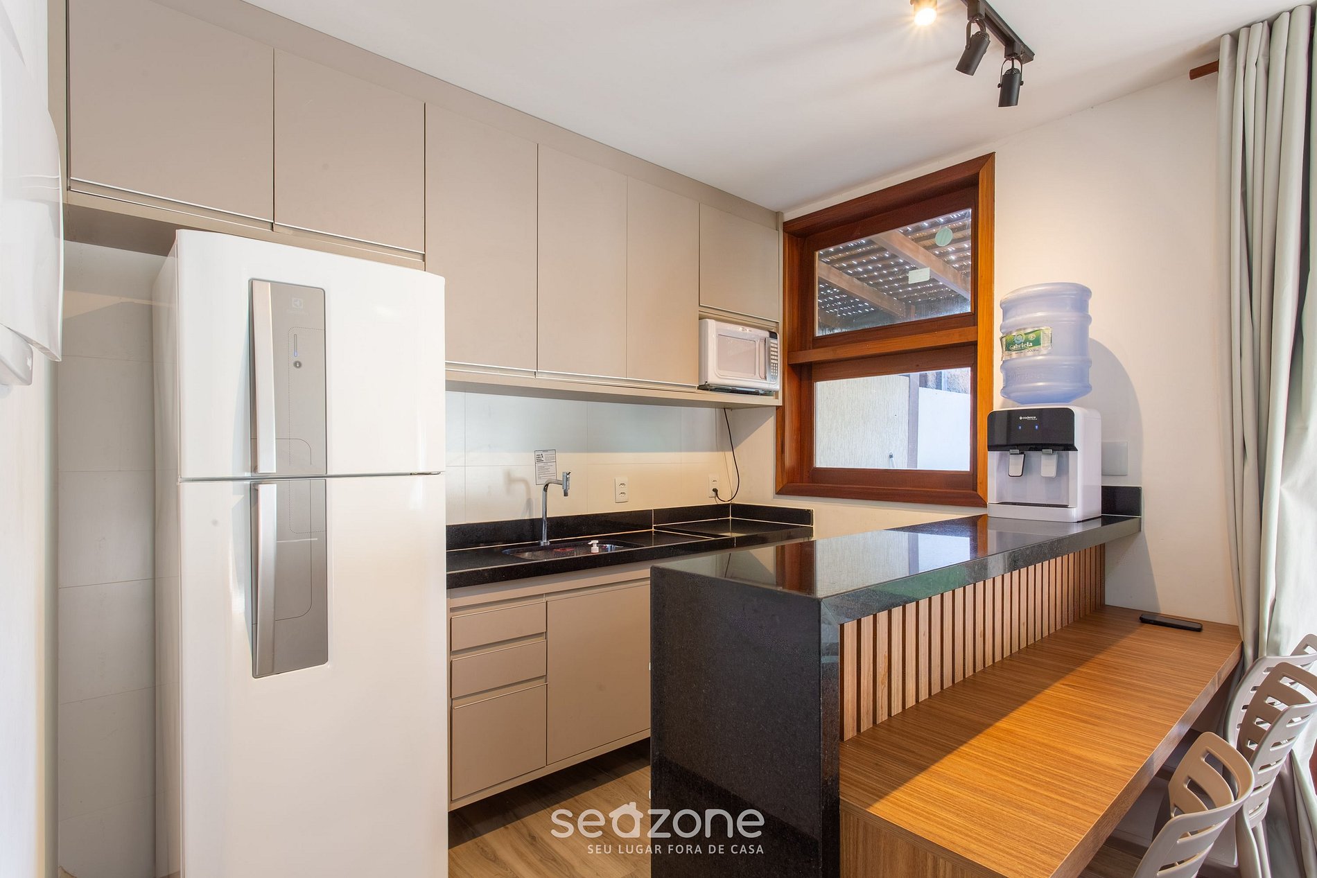 - Cozinha completa com geladeira, fogão e forno a gás, micro-ondas, sanduicheira, Kit café (suporte para filtro, garrafa térmica), chaleira (caneco), liquidificador, panelas, louças e utensílios;