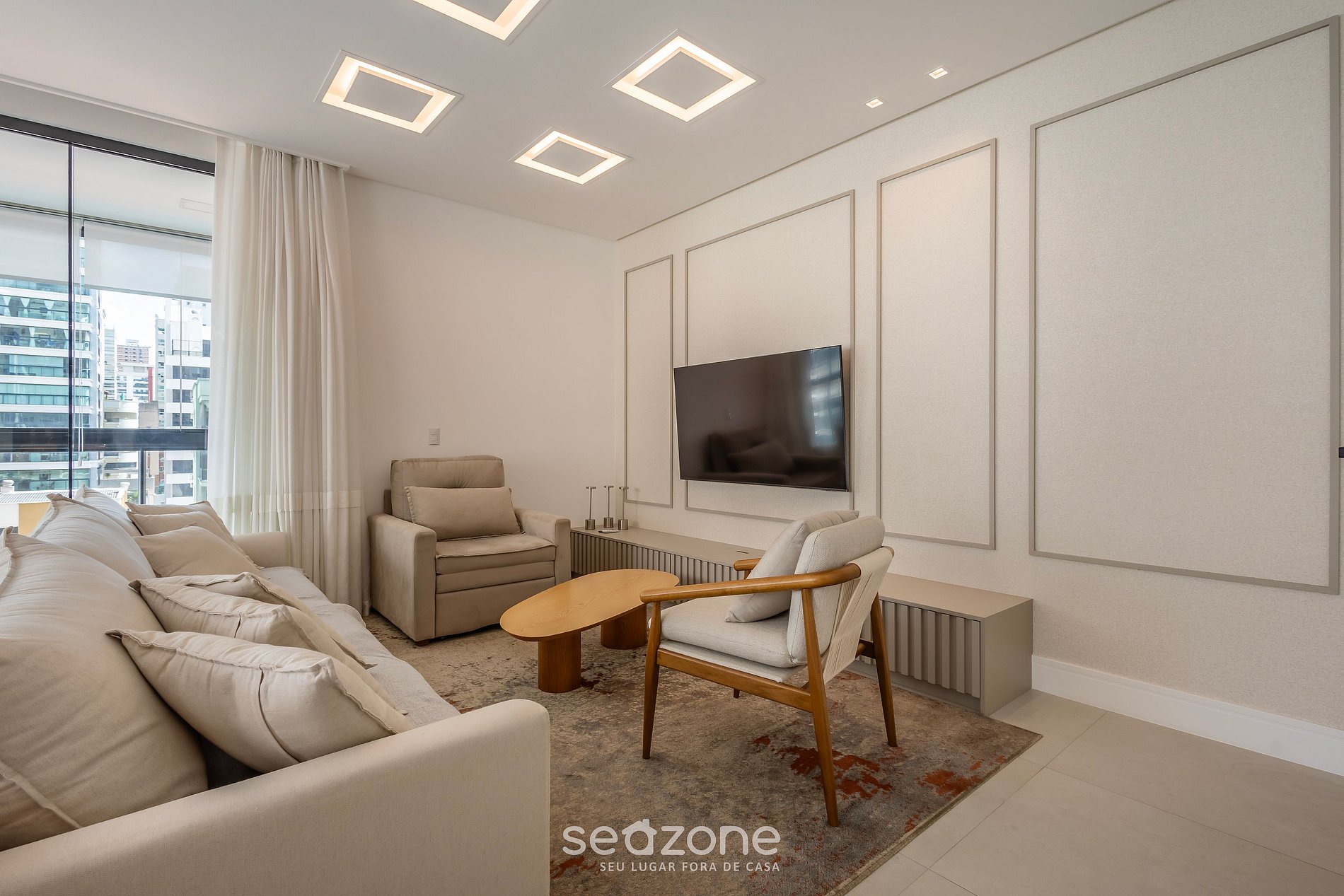 - Sala de estar com Sofá, poltrona, Smart TV e ar-condicionado;