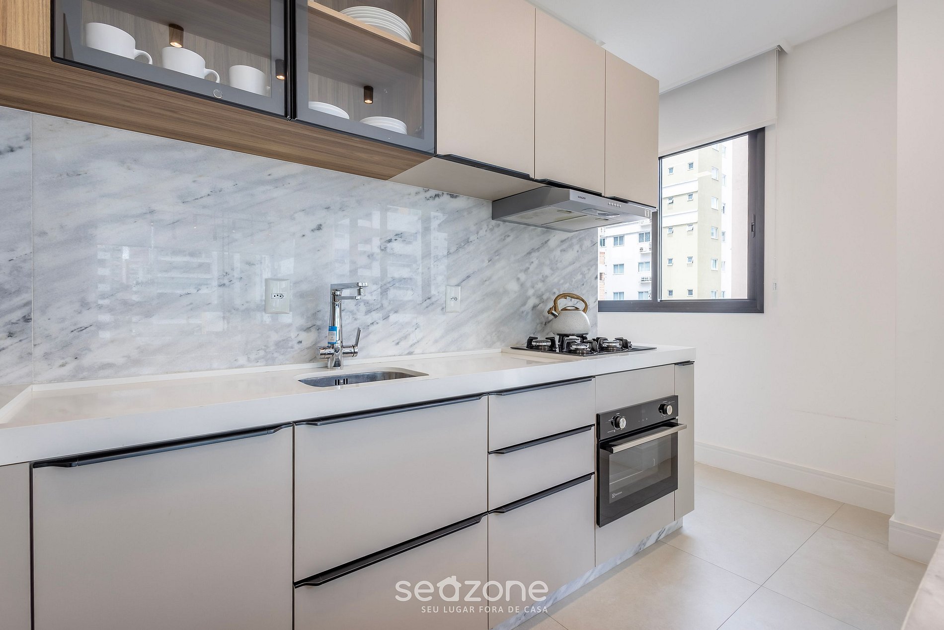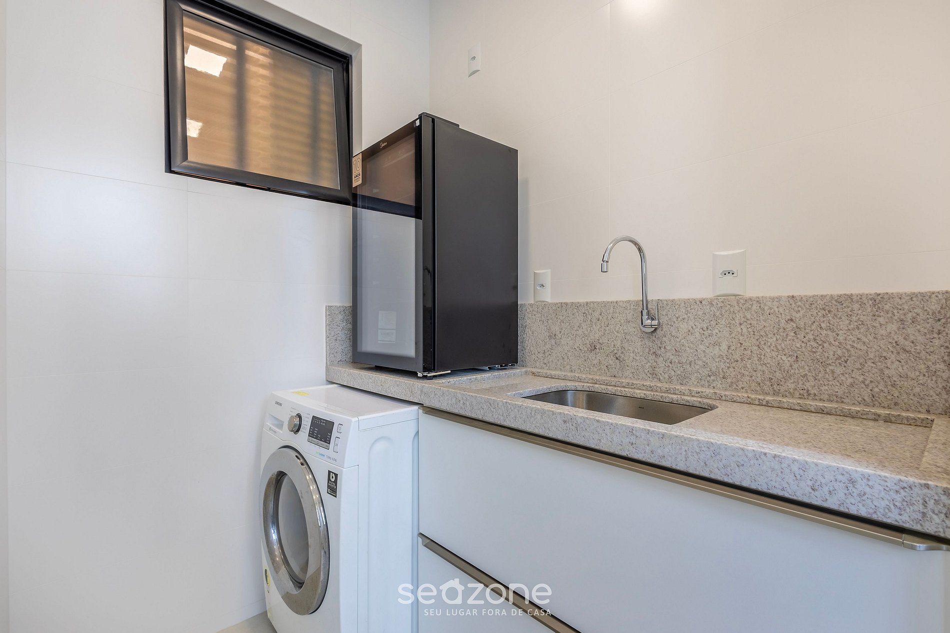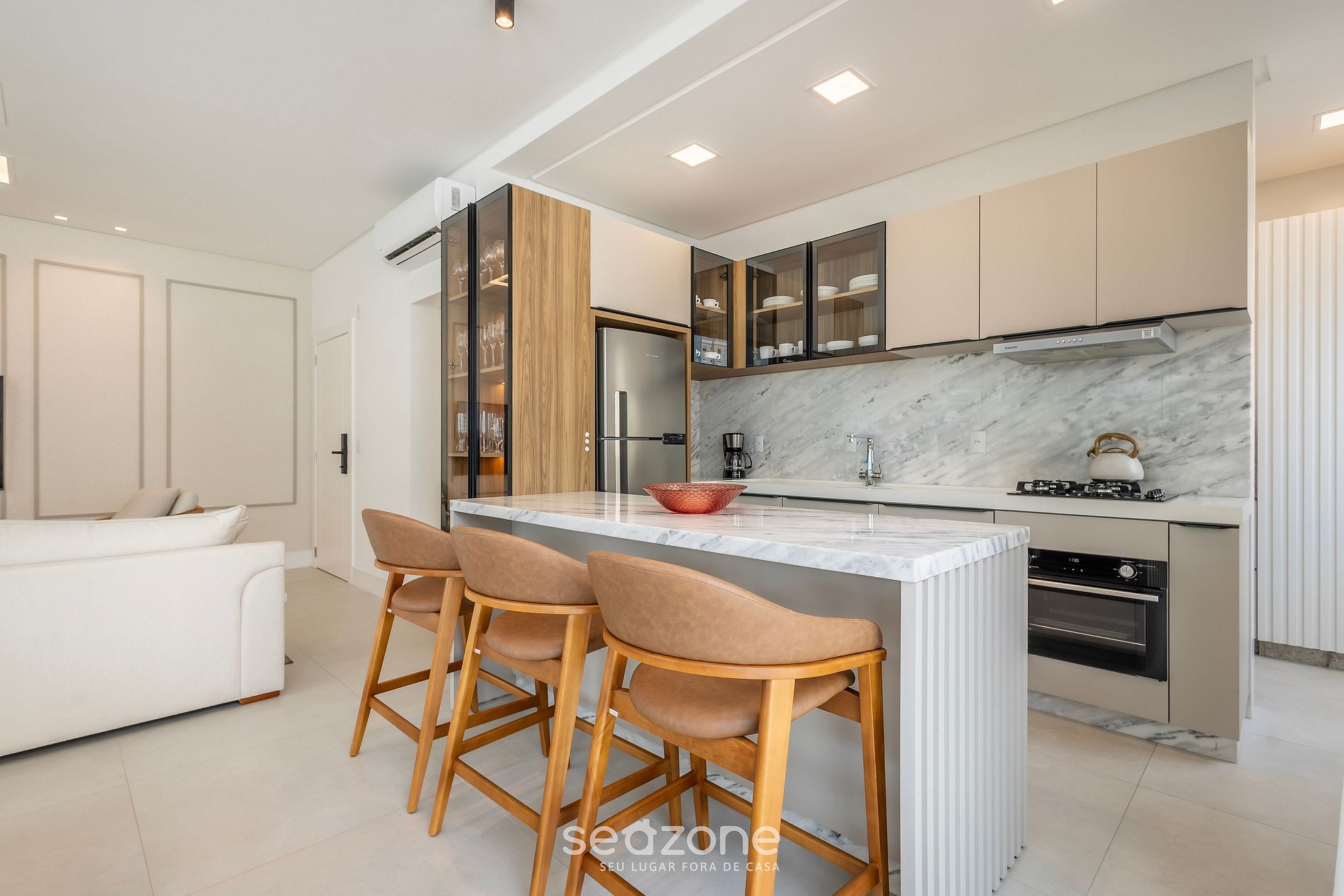 - Cozinha completa com geladeira, cervejeira, fogão cooktop a gás, forno elétrico, micro-ondas, sanduicheira, cafeteira elétrica, chaleira elétrica, liquidificador, taças de vinho, panelas, louças e utensílios;