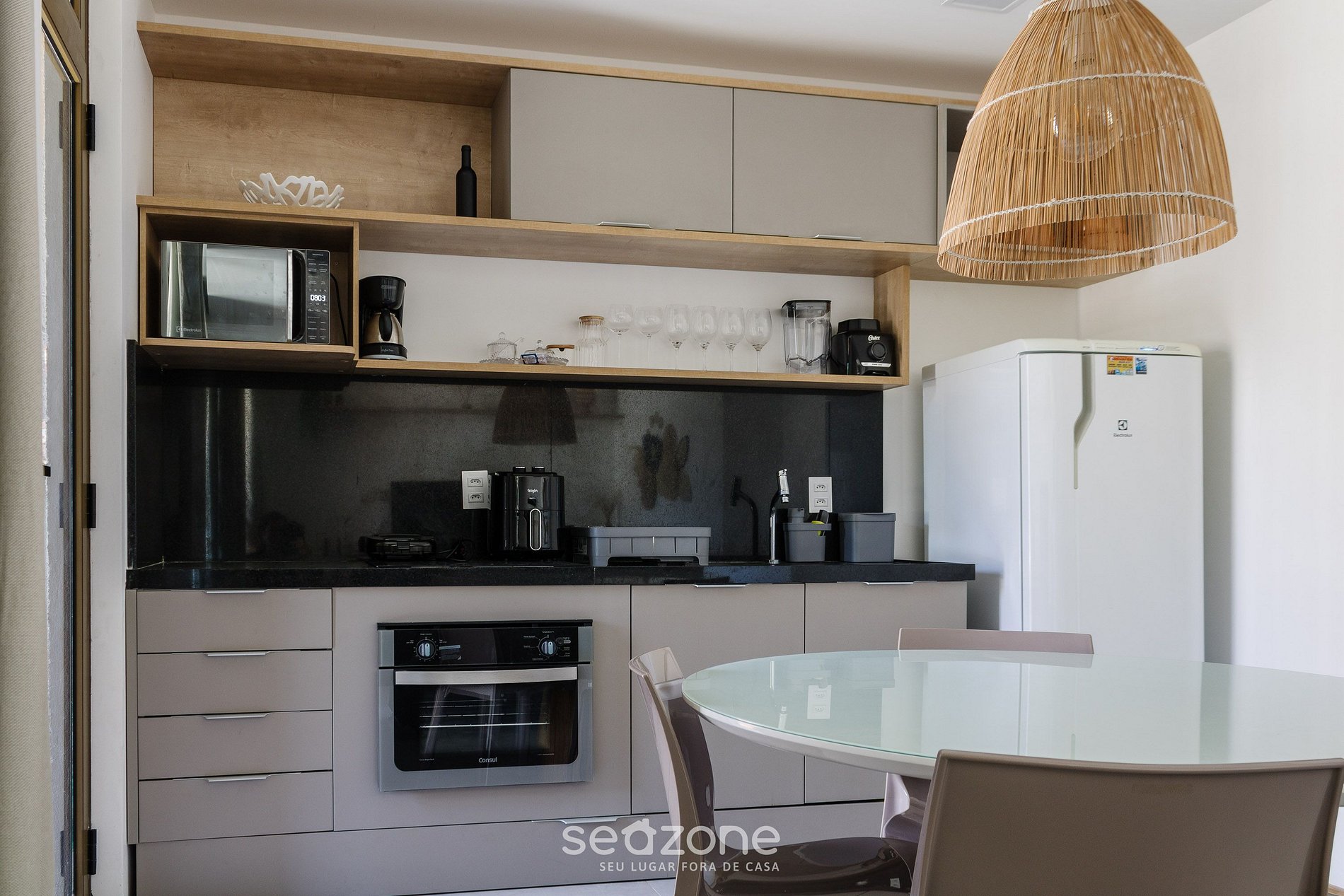 - Cozinha completa com Liquidificador, Sanduicheira, Cafeteira, Microondas, Airfryer, Geladeira, Cooktop, Forno ;
