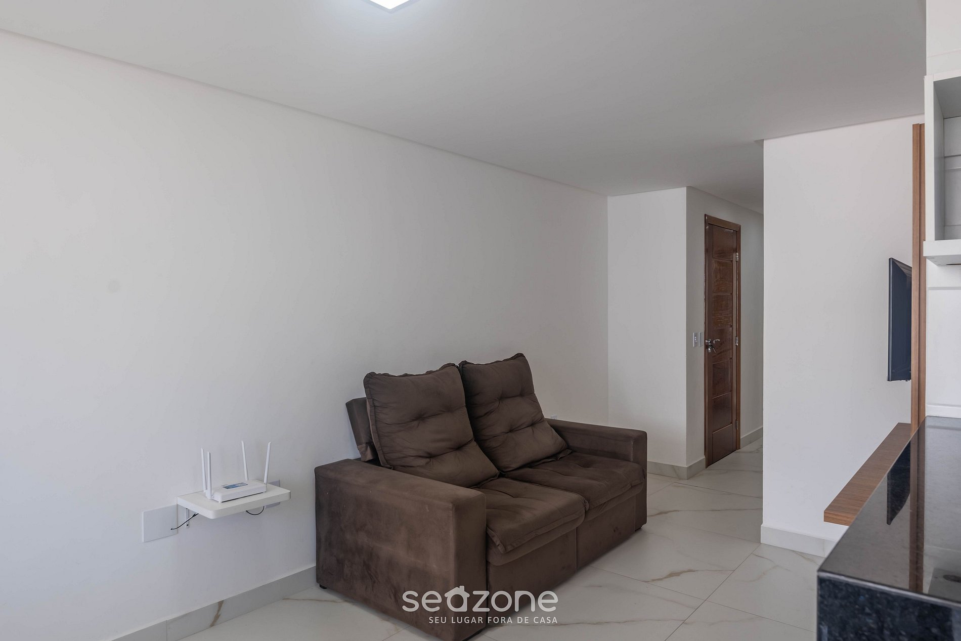 - Sala de estar com Sofá, ventilador portátil e Smart TV;