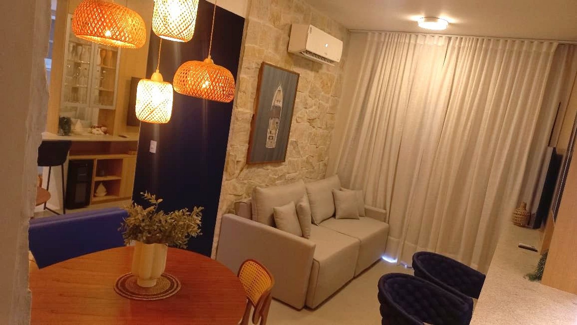- Sala de estar com sofá, Smart Tv e ar-condicionado;