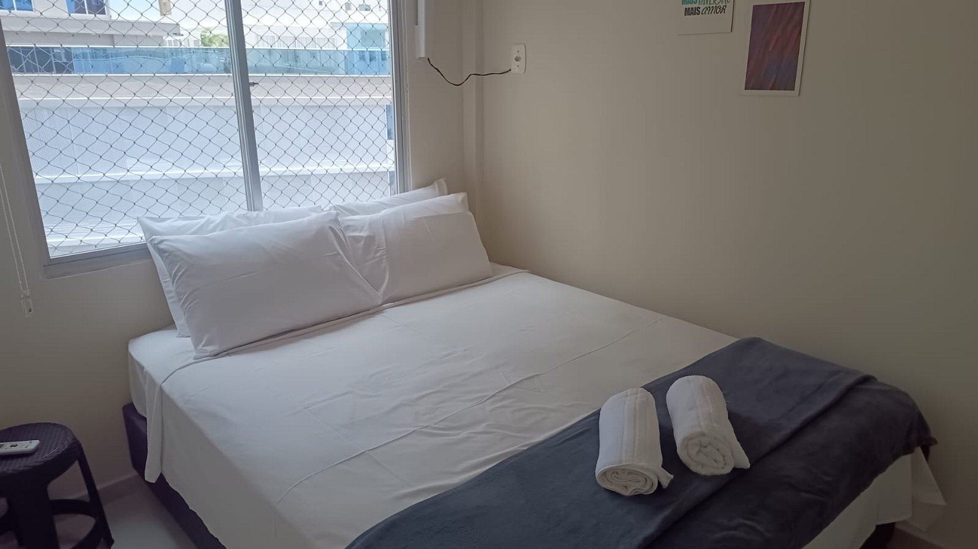 - 1 Quarto com cama casal, armário e ar-condicionado;