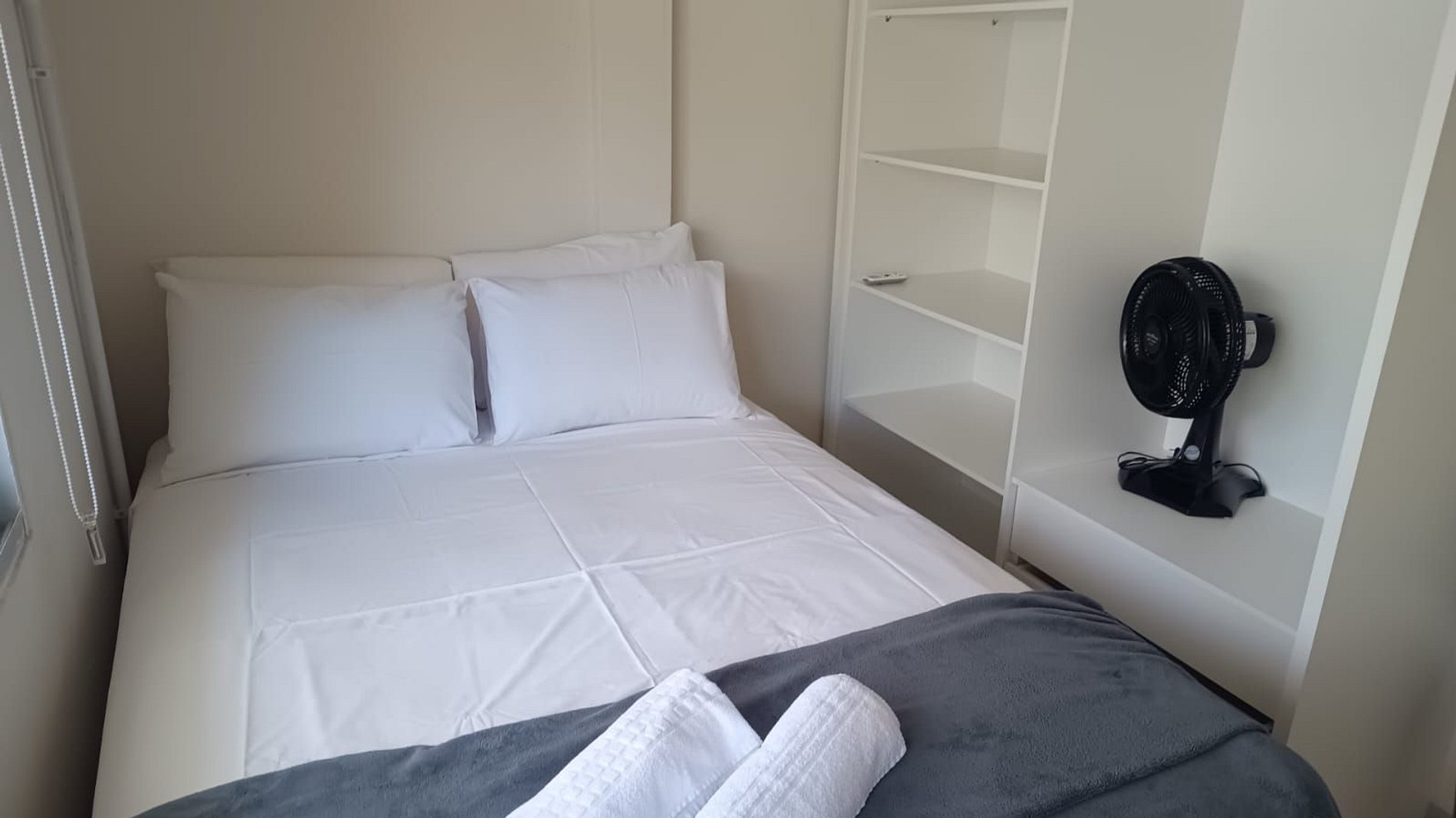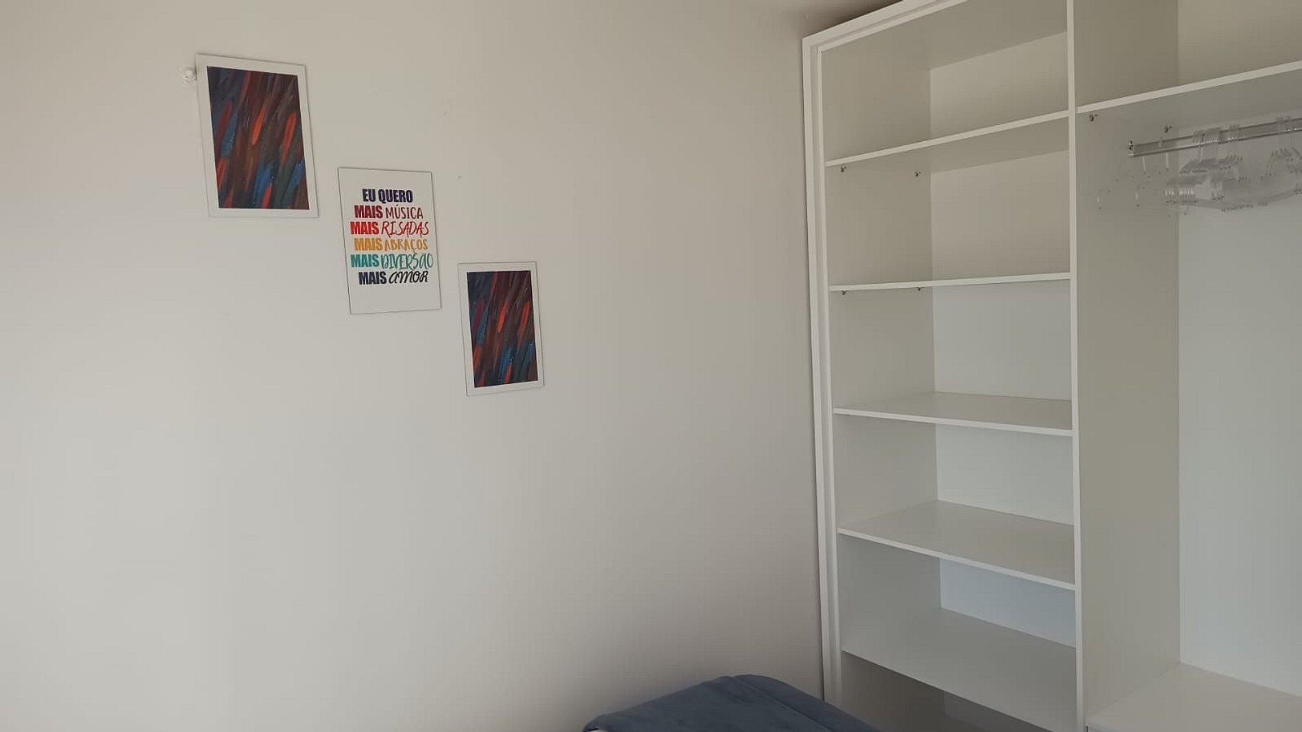 - 1 Quarto com cama queen, armário e ar-condicionado;