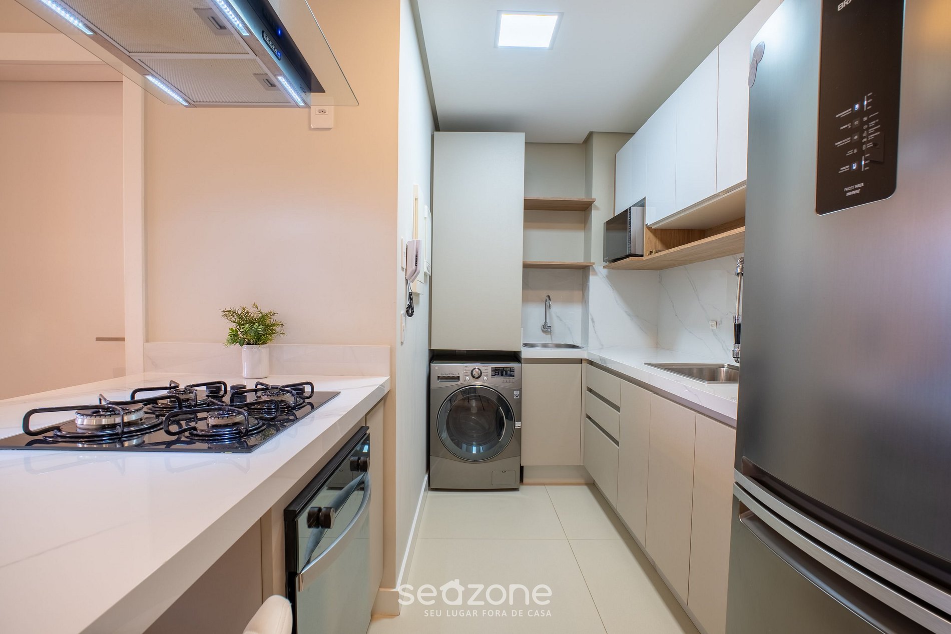 - Cozinha completa com geladeira, fogão cooktop a gás, forno elétrico, micro-ondas, sanduicheira, chaleira, liquidificador, taças de vinho, panelas, louças e utensílios;