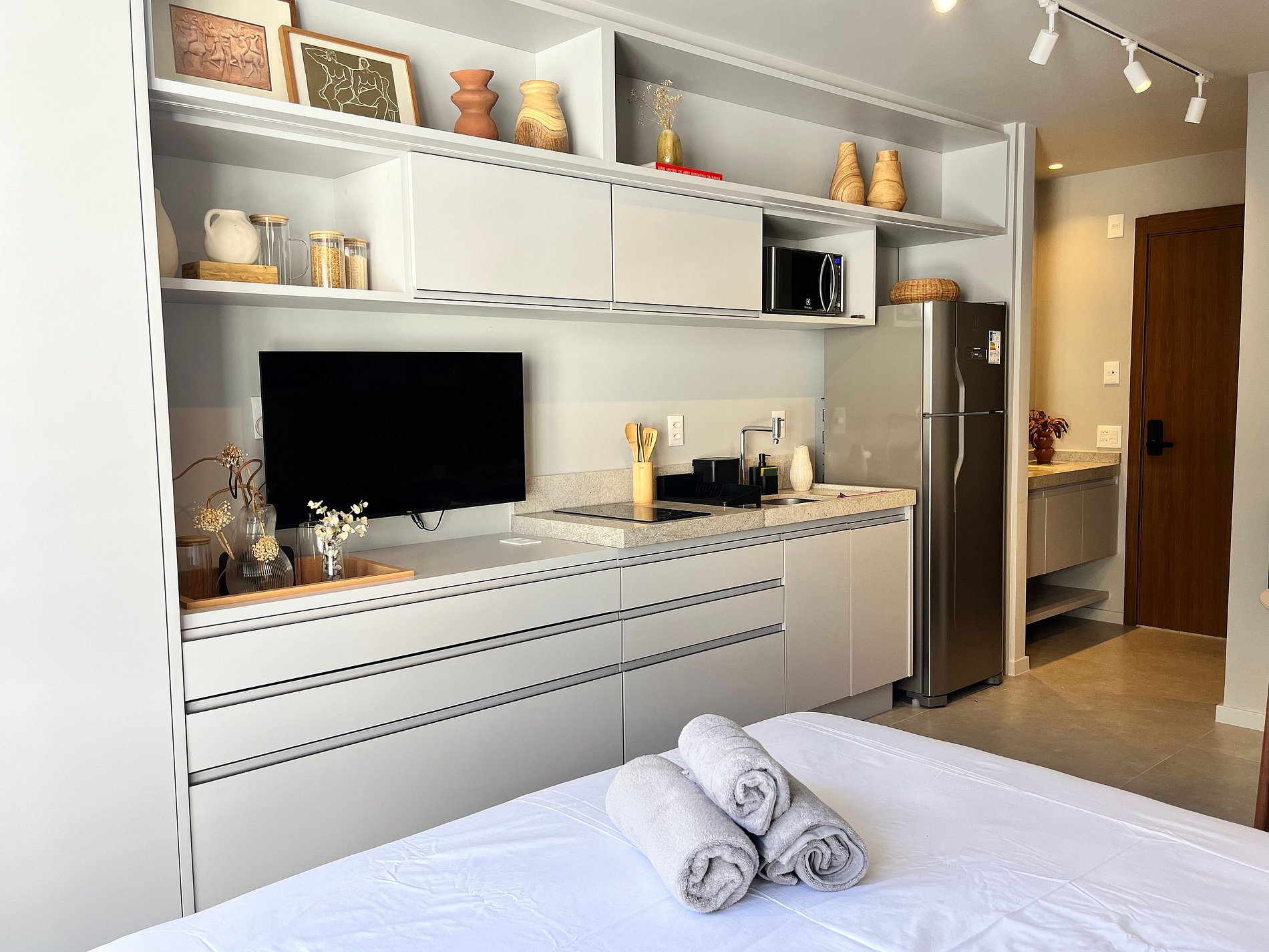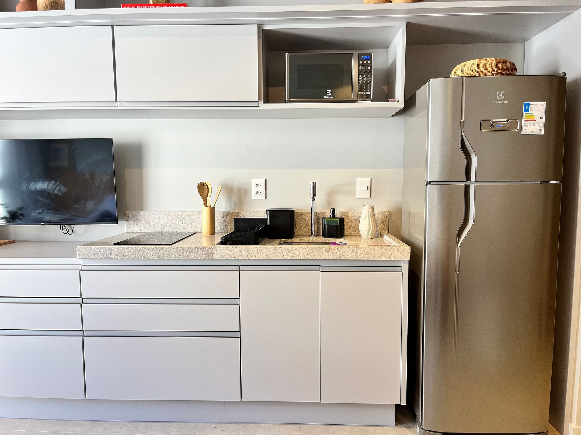 - Cozinha completa com geladeira, fogão cooktop (indução), micro-ondas, sanduicheira, cafeteira italiana, liquidificador, taças de vinho, panelas, louças e utensílios;