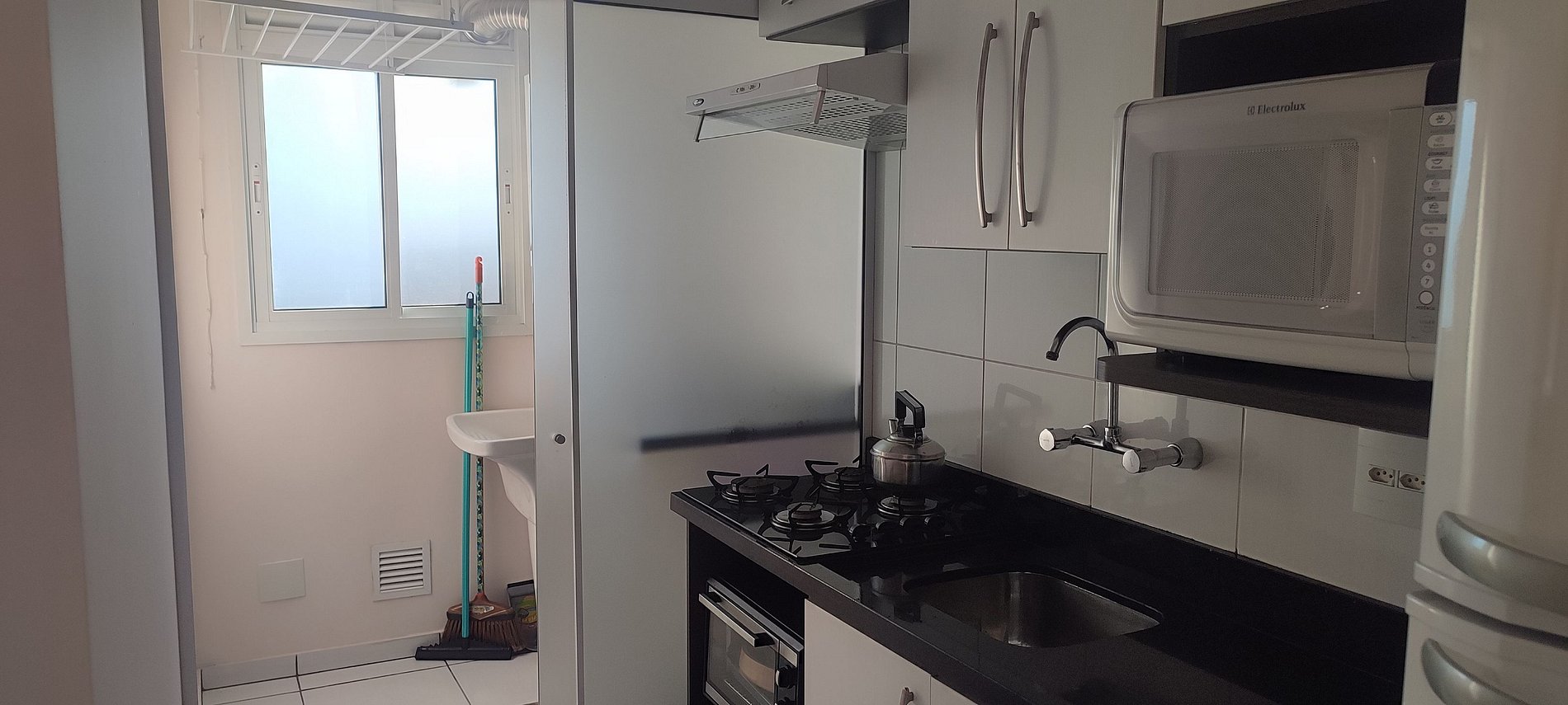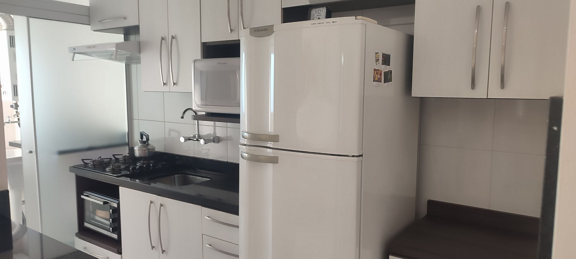 - Cozinha completa com geladeira, fogão cooktop (gás), forno elétrico, micro-ondas, sanduicheira, cafeteira elétrica, chaleira, liquidificador, taças de vinho, panelas, louças e utensílios;